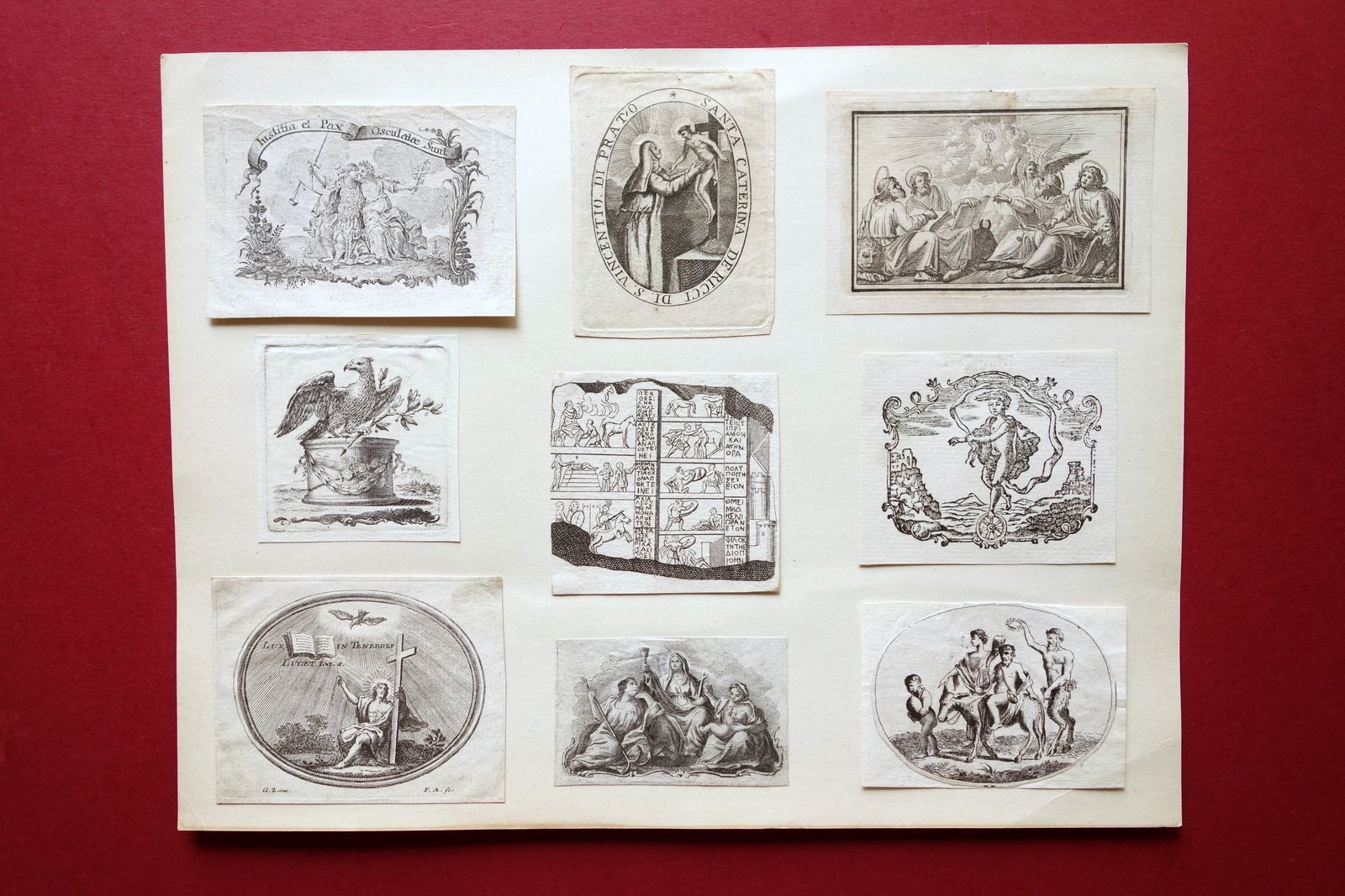 Nove incisioni - finalini, Nove incisioni (fregi - finalini) di piccolo formato applicate su supporto cartaceo fine Settecento - primi anni dell'Ottocento circa Serie di nove fregi - finalini incisi in b/n su carta, tutti di piccolo formato, applicati su supporto cartaceo; cm 23x30. (supporto). Condizioni di conservazione Incisioni in buone condizioni con qualche piccola lieve brunitura e minimi segni del tempo, rifilate ai margini. Angolo inf. sinistro di una incisione con una minima mancanza. Per maggiori dettagli vedi foto. INC.0071 N