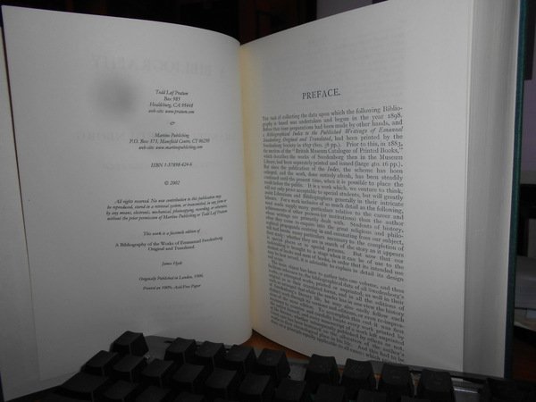 Rev. JAMES HYDE. Mansfield, Martino, 2002. A Bibliography Of The Works Of Emanuel Swedenborg. In-8°, tela verde con titolo in oro al dorso. xvi, 742 pp. + errata. Come nuovo. Uff. B - II - 2