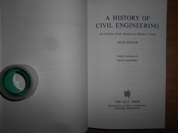 HANS, STRAUB. Massachusetts, Institute of Technology Cambridge, 1964. A History of Civil Engineering. An Outline from Ancient to Modern Times. In-16° grande, tela verde con titolo in oro entro tassello al dorso. xviii, 258 pp. con alcune illustrzaioni nel testo e 79 figure in tavole fuori testo. Come nuovo. Uff. C - II - 6