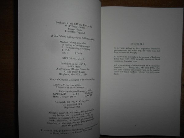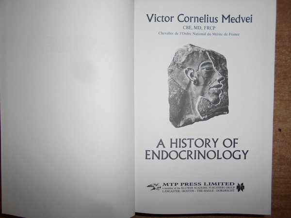 VICTOR CORNELIUS MEDVEI. Boston, MTP Press Limited, 1982. A HISTORY OF ENDOCRINOLOGY. In-8°, pelle bleu con titolo in oro al dorso. xviii, 913 pp. con alcune illustrazioni nel testo. Ottimo esemplare. Uff. C - IV - 4
