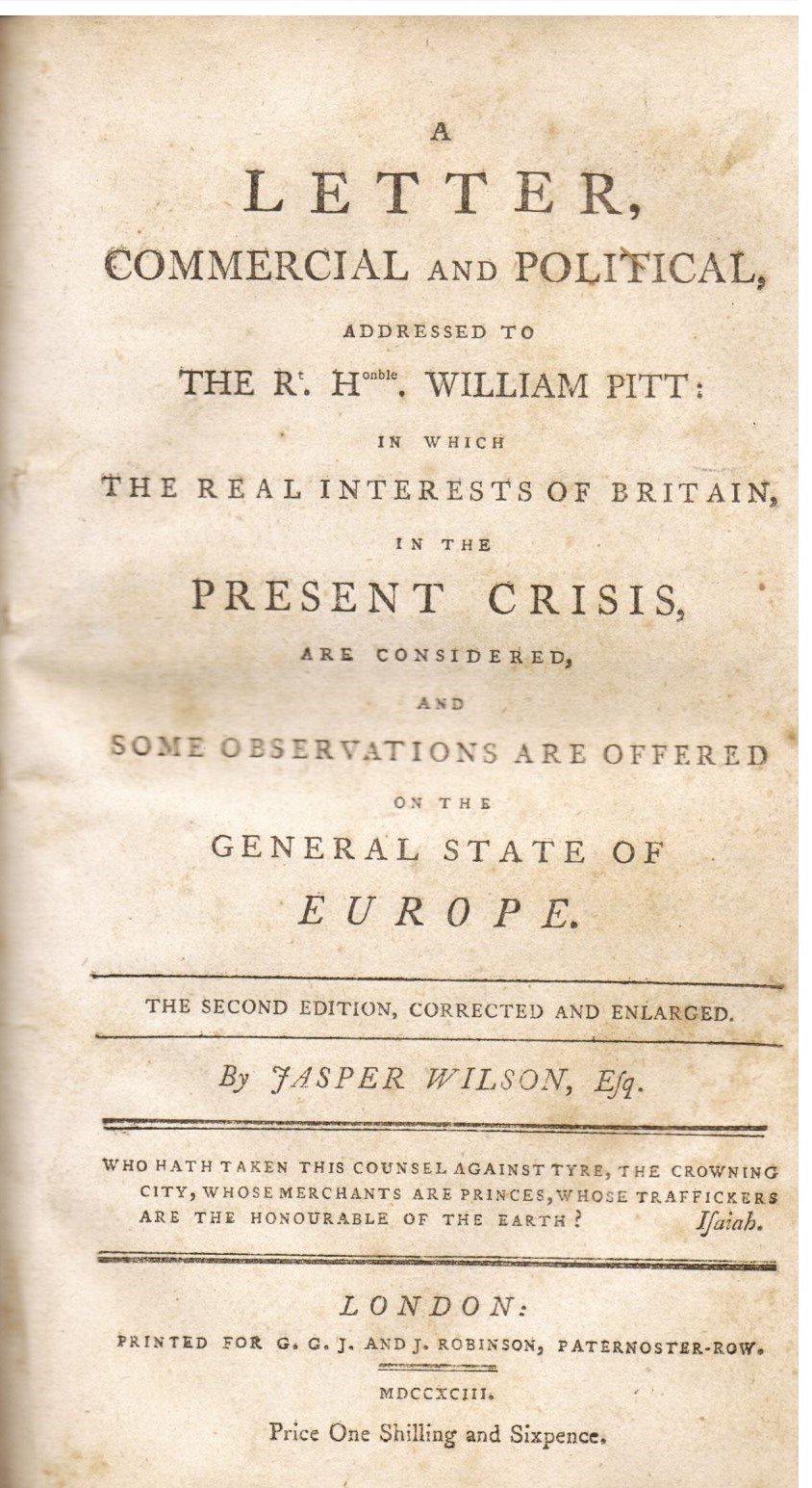 A letter, commercial and political, addressed to the R. H.onble. William Pitt in which the real interests of Britain in the present crisis are considered, and some observations are offered on the general state of Europe. The second editio, corrected and revised bay Jasper Wilson