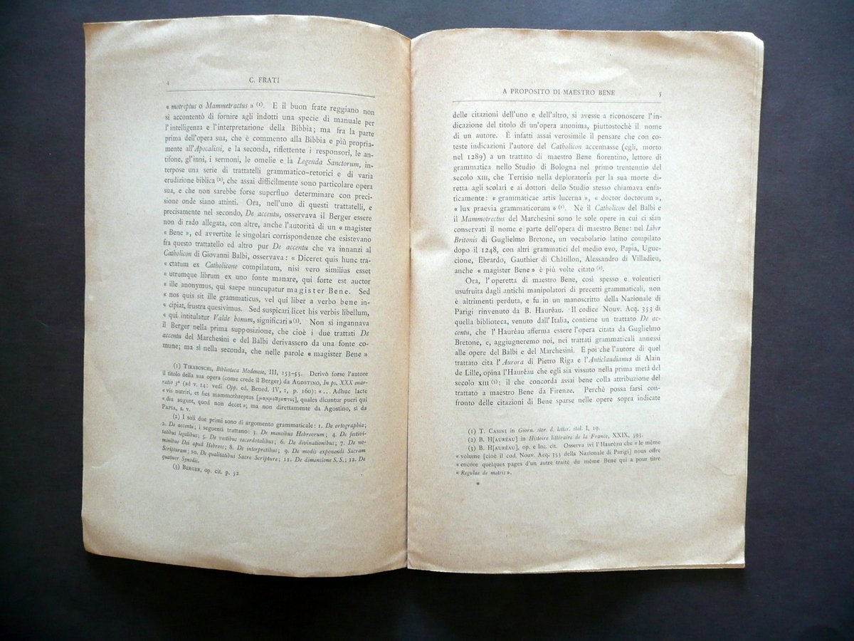 Carlo Frati, A proposito di Maestro Bene nota di Carlo Frati Forzani e C. Tipografi del Senato, Roma 1895; cm 26,5x17,5; pp. 12; brossura ed. Condizioni di conservazione Esemplare complessivamente ben conservato con leggeri accenni d'ingiallimento agli interni e ai margini delle brossure, dovuti al tipo di carta; brossure con qualche lieve traccia di sporco; brossura post. e margine est. dell'ultima pagina con un minimo strappetto. Pagine ancora intonse. Pagine ancora intonse. SC03.D13055 N