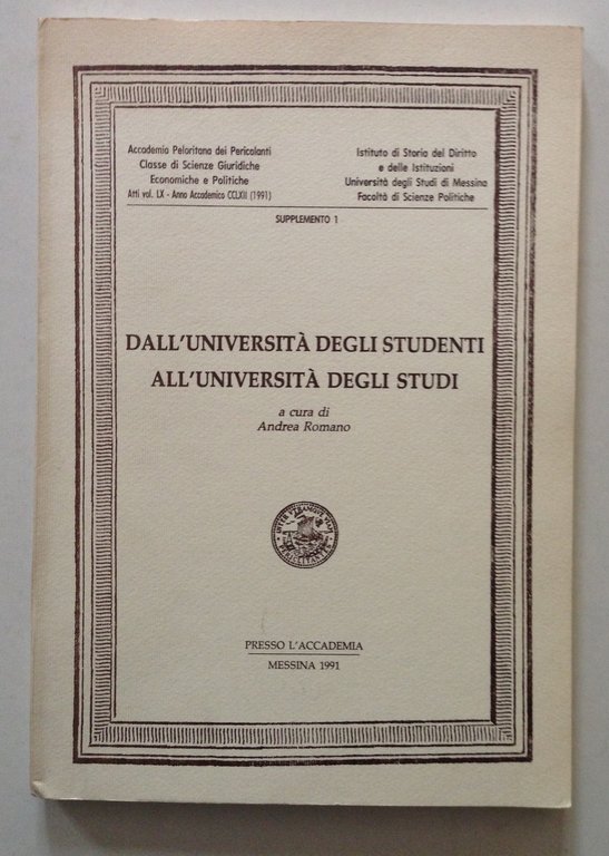 A. Romano (a cura di), Dall'Università degli Studenti all'Università degli Studi Presso l'Accademia Messina, 1991; cm 24.5x17; pp. 196; testo parte in italiano, parte in spagnolo; br. ed. Condizioni di conservazione Esemplare in buono stato con leggere tracce d'uso. SETT132.L13205 MT