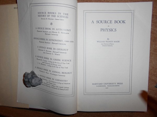 By WILLIAM FRANCIS MAGIE. Cambridge, Massachusetts Harward University Press, 1965. A SOURCE BOOK in PHYSICS. In-8°, tela edit. con titolo in oro al dorso e sovracopertina. xiv, 620 pp. con alcune illustrazioni nel testo. In ottimo stato di conservazione o come nuovo. Uff. C - II - 3
