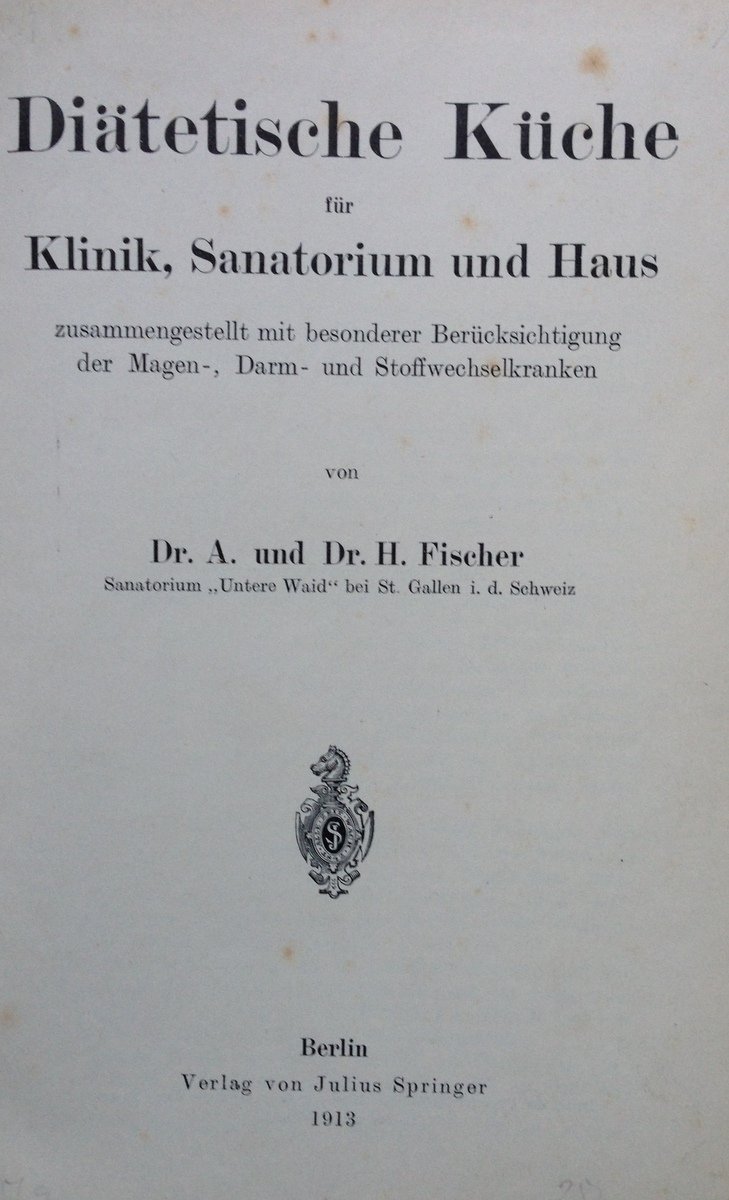 A. Und H. Fischer, Diaetetische Kueche fuer Klinik, Sanatorium und Haus Verlag Von Julius Springer, Berlin 1913, cm 21x14, pp. IV-258, cartonato ed. Condizioni di conservazione Esemplare in buono stato con leggere tracce d'uso. SETT119.L11215 MT