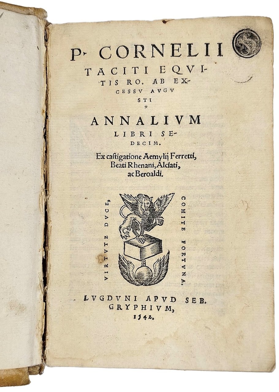 >3 opere in un volume in-8 (163x105 mm), I) pp.  710, (26), iniziali xilografiche, caratteri corsivo e romano; include anche De situ, moribus, & populis Germaniae libellus, al foglio Q7 e Dialogus, an sui seculi oratores, al foglio S2v ; II) 52, (4), caratteri corsivo, greco e romano, a cura di Thomas Sertinus , il cui nome appare nella prefazione; III) 363, (1), caratteri corsivo, greco, romano, iniziali e fregi xilografici. Legatura coeva in pergamena rigida, titolo ms. lungo il dorso (piccola mancanza al dorso e cuffia inferiore restaurata). Impresa tipografica sui tre frontespizi ed altra in fine alle opere seconda e terza. Dedica di Emilio Ferretti, compilatore delle annotazioni costituenti la seconda opera, al card. Francesco Turnon, ed altra nella terza del B. Renano al card. Bernardo, vescovo di Trento. Prima edizione delle brevi annotazioni (''annotatiunculae'') del Ferretti, il quale si preoccupò di raccogliere anche quelle, pubblicate in precedenza, degli altri dotti umanisti B. Renano, Alciati ed il Beroaldo. Bella edizione della monumentale opera storiografica latina di Tacito, con i commenti e le correzioni del giurista e umanista Emilio Ferretti. Complessivamente un buon esemplare, con lievi aloni d'umido, tracce d'uso e qualche antica chiosa ms. Baudrier VIII, 147 e 164. BMC, French, 412. Adams T-26.