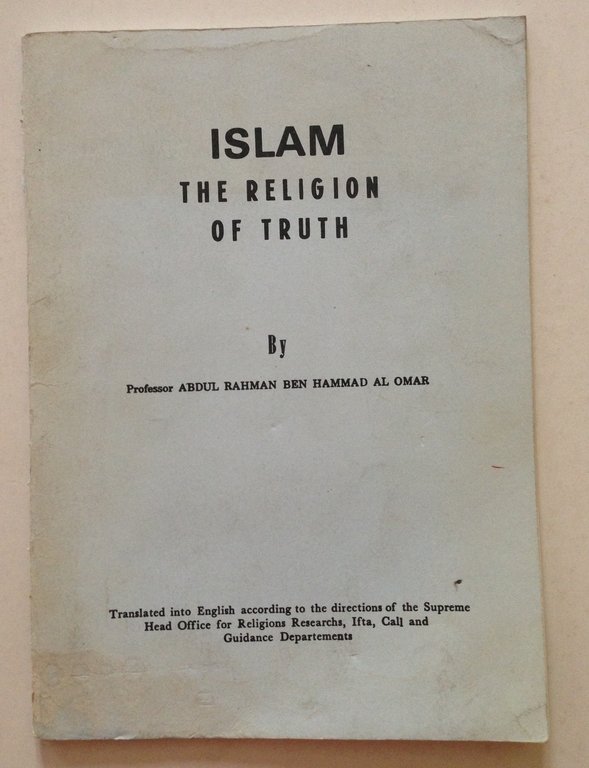 Abdul Rahman Ben Hammad Al Omar, Islam The religion of truth Al Farazdak Press, s.d. (anni '80 circa); cm 24x17; pp. 62; testo in lingua inglese, alcuni testi in arabo; scritta a penna al frontespizio; br. ed. Condizioni di conservazione Volume ben conservato con leggere tracce d'uso; brossura editoriale con minime macchiette e con minime pieghette agli angoli, dorso con qualche abrasione. OPEB.3514 MT
