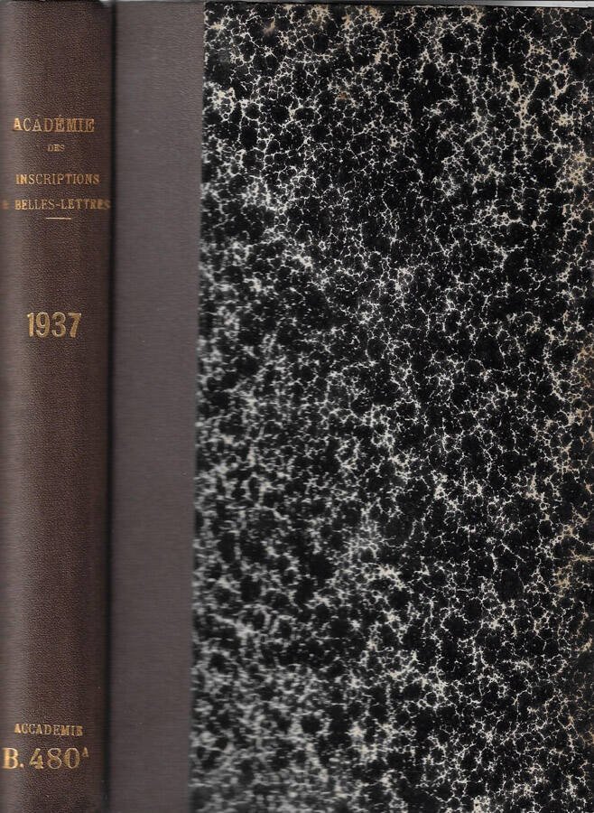 Annata completa delle relazioni delle riunioni dell'"Académie des inscriprions & belles-lettres" anno 1937. Lingua francese. Volume successivamente rilegato raccogliente le varie uscite in un unico tomo. Segno a penna al frontespizio; pagine brunite dal tempo, in particolare ai tagli. Il volume potrebbe contenere timbri ed etichette dell'Istituto Veneto, regolarmente acquisito dalla nostra libreria. Coperta rigida in mezza tela con titoli oro al dorso ingiallita dal tempo presentante segni di usura da scaffale ai margini e trace di usura da sfregamento ai piatti. Numerazione delle pagine consecutiva tra le uscite (rilegate in un unico volume). Numero pagine complessive 489.