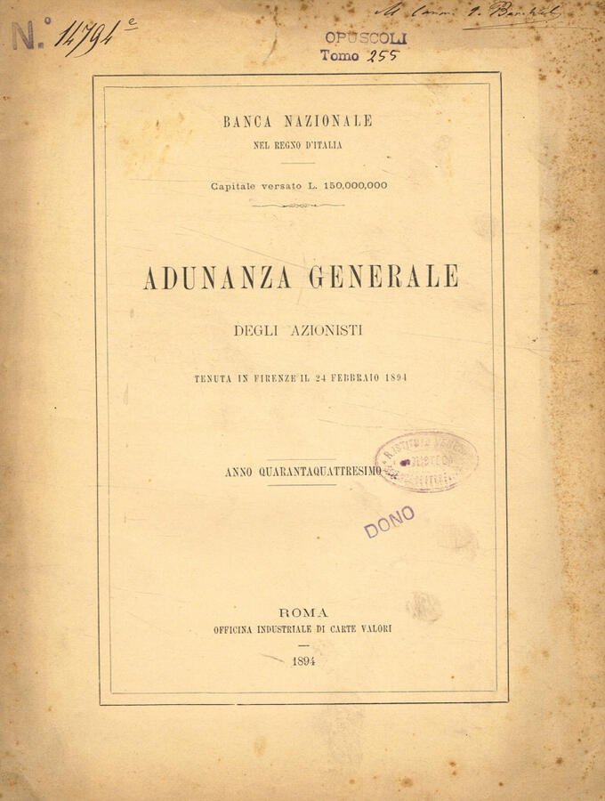 Adunanza generale degli azionisti tenuta in Firenze il 24 febbraio 1894. Anno quarantaquattresimo | Libri antichi e moderni | Banca Nazionale Nel Regno D'Italia