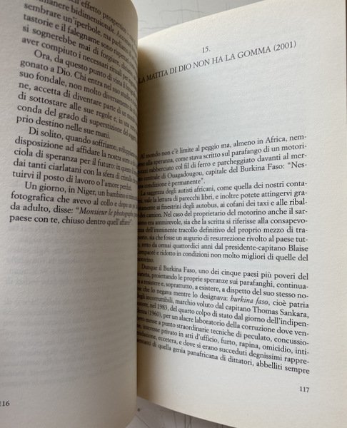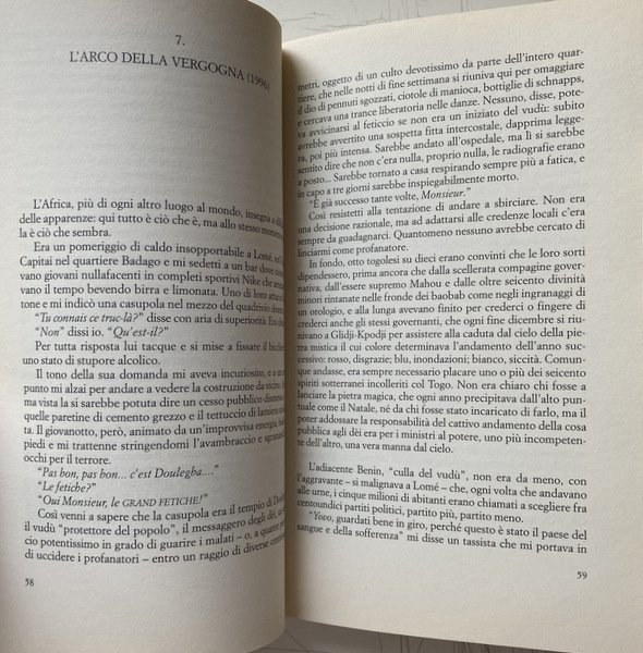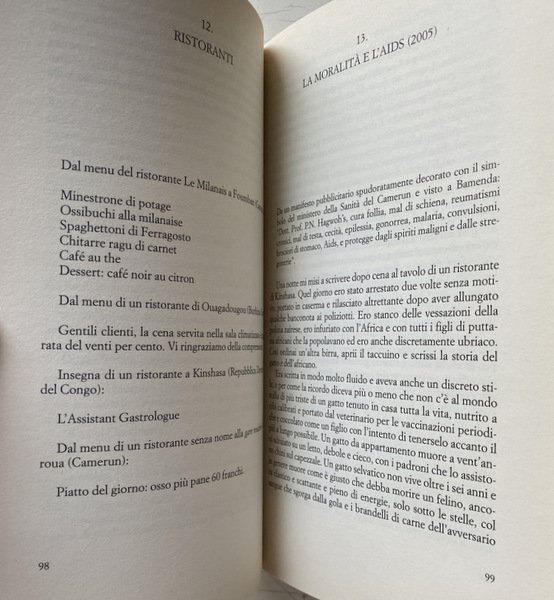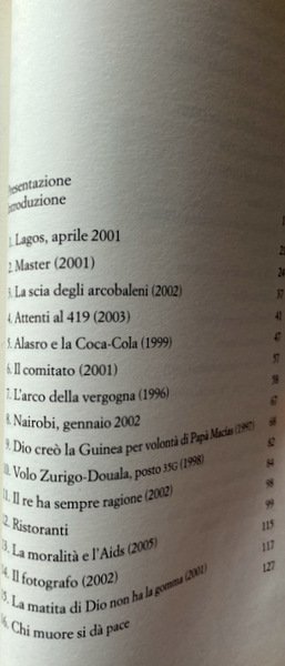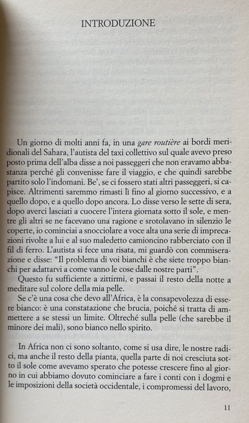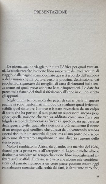 Soggetti: Viaggi, Letteratura di viaggio, Guide turistiche, Africa, Cultura locale, Tradizioni, Geografia, Descrizioni, Viaggiare, Racconti, Aneddoti, Curiosità, Città, Mentalità africana, Terzo Mondo, Povertà, Miseria, Cibo, Ristoranti, Gastronomia, Turismo, Tempo libero, Politica, Colpo di stato, Tribù africane, Guerre, Deserto, Natura, Fauna, Animali, Safari, Potere, Colonialismo, Imperialismo, Sfruttamento, Miniere, Diamanti, Stati, Schiavitù, Kenya, Nairobi, Guinea, Papà Macias, AIDS, HIV, Vaccini, Nigeria, Lagos, Apartheid, Neri, Bianchi, Uranio, Tro, Risorse energetiche, Mobutu, Serpenti, Arlit, Niger, Egitto, Oasi, Nana Benz, Banha, Reportage, Giornalismo, Democrazia, Guerra civile, Occidente, Armi, Bambini, Esercito, Militari, Algeria, Islam, Mali, Emigrazione, Manioca, Arachidi, Dar er Salaam, Tanzania, Gris-gris, Coccodrilli, Pitoni, Kampala, Leoni, Uganda, Ruanda, Alberghi, Catene occidentali, Multinazionali, Riti, Rituali, Danze, Benin, Vudu, Mercati, Swaziland, Mswati III, Dittatori, Ras, Capi, Burkina Faso, Corruzione, Ricchezza, Militari, Continente nero, Miliziani, Guerriglieri, Malabo, Lomé, Francese, Togo, Agadez, Thomas Sankara, Kinshasa, Camerun, Gran Bretagna, Francia, Ghana, Douala, Nilo, Senegal, Negritudine, Léopold Sédar Senghor, Magia, Juju, Immigrati clandestini, Europa, Chiesa, Costa d'Avorio, Slums, Musulmani, Cristiani, Animismo, Animisti, Religione, Yoruba, Conflitti etnici, Pregiudizio, Razzismo, Indipendenza, Dan Zaki, Movimenti di liberazione, Socialismo, Hutu, Libri Vintage Fuori catalogo, Francisco Macías Nguema, Genocidio, Voyage, Travel literature, Tour guides, Africa, Local culture, Traditions, Geography, Descriptions, Travel, Stories, Anecdotes, Curiosities, Cities, African mindset, Third world, Poverty, Misery, Food, Restaurants, Gastronomy, Tourism, Leisure, Politics, Coup, African tribes, Wars, Desert, Nature, Animals, Power, Colonialism, Imperialism, Exploitation, Mines, Diamonds, States, Slavery, Vaccines, Blacks, White, Uranium, Energy resources, Snakes, Egypt, Oasis, Journalism, Democracy, Civil war, West, Weapons, Children, Army, Military, Emigration, Cassava, Peanuts, Crocodiles, Pythons, Lions, Rwanda, Hotels, Western chains, Multinationals, Rites, Rituals, Dances, Markets, Dictators, Chiefs, Corruption, Wealth, Military, Black continent, Militiamen, Guerrillas, French, Cameroon, Great Britain, France, Negritude, Magic, Illegal immigrants, Europe, Church, Ivory coast, Muslims, Christians, Animism, Animists, Religions, Ethnic conflicts, Prejudice, Racism, Independence, Liberation movements, Socialism, Out of print books, Genocide