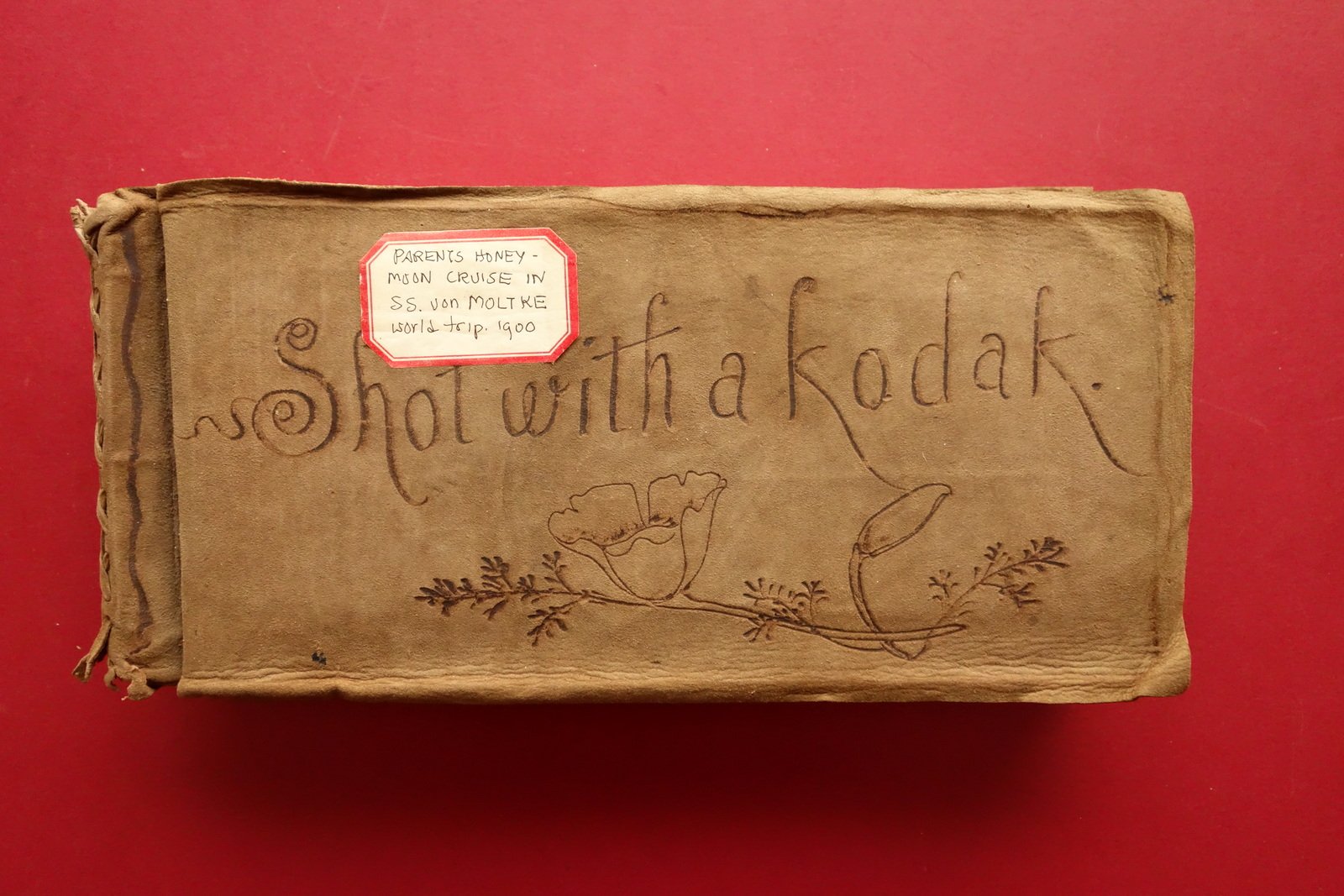 Album (150 fotografie originali all'albumina), Album di viaggio viaggio di nozze nel Mediterraneo e nel vicino Oriente a bordo del piroscafo Von Moltke" 1900(?) 1900(?); album fotografico d'epoca in piena pelle morbida con, al piatto anteriore, la dicitura Shot with a Kodak impressa a secco e con applicata etichetta descrittiva redatta a mano in lingua inglese; l'album contiene 150 belle fotografie applicate, tutte originali all'albumina e dello stesso formato orizzontale, tutte corredate da didascalia descrittiva redatta a mano al margine inferiore. Dimensioni delle fotografie cm 9x28; dimensione dell'album cm 15x33. Condizioni di conservazione Complessivamente buone condizioni con tracce d'uso, margini e angoli dell'album leggermente sgualciti, cuffie con piccoli strappetti. Fotografie in buone condizioni con leggere tracce del tempo e, in alcuni casi, lieve sbiadimento dell'immagine (vedi foto); pagine d'album in carta sottile, con alcuni minimi difetti (pieghette / tracce di pieghette / strappetti) ai margini e agli angoli. Alcune delle ultime pagine e fotografie con pochi minuscoli forellini da tarlo (vedi foto). Per ulteriori dettagli vedi foto. Bellissima documentazione fotografica realizzata mediante una delle prime fotocamere Kodak a sviluppo istantaneo. In aggiunta alle scene di viaggio sul piroscafo "Von Moltke", vi sono numerose fotografie delle città e nazioni visitate, con particolare attenzione alle attrazioni archeologiche e storiche. di seguito un breve elenco delle nazioni e delle località di cui sono presenti fotografie: Portogallo (Madeira, Funchal); Grecia e Malta (Malta, Atene); Turchia (Efeso, Costantinopoli, Bosforo); Egitto (il Cairo, le piramidi, Luxor, Karnak, Tebe, Alessandria d'Egitto); Israele (Gerusalemme, Betlemme); Algeria (Algeri); Costa Azzurra (Nizza, Villafranca, Montecarlo-Monaco); Italia (Genova, Pisa, Capri, Pompei, Roma). L'album è datato 1900, ma le fotografie raffiguranti gli addobbi per la visita del Re Edoardo VII a Roma porterebbero a postdatare l'album al 1903. Unico. SETT233.L24650 N "