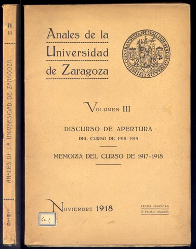 Zaragoza, Tipografía de Gregorio Casañal, 1918 ["Anales de la Universidad"]. 4to. mayor; 33 pp. + 129-XLI pp., 8 hs. y cuatro gráficos plegados. Cubiertas originales.