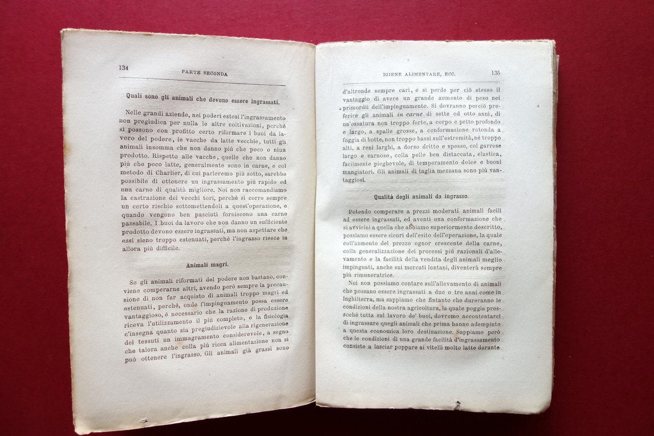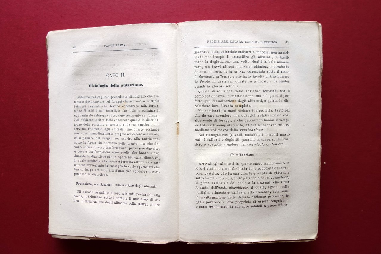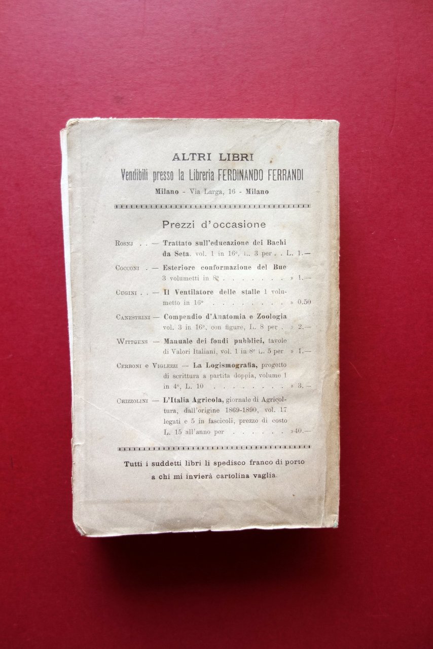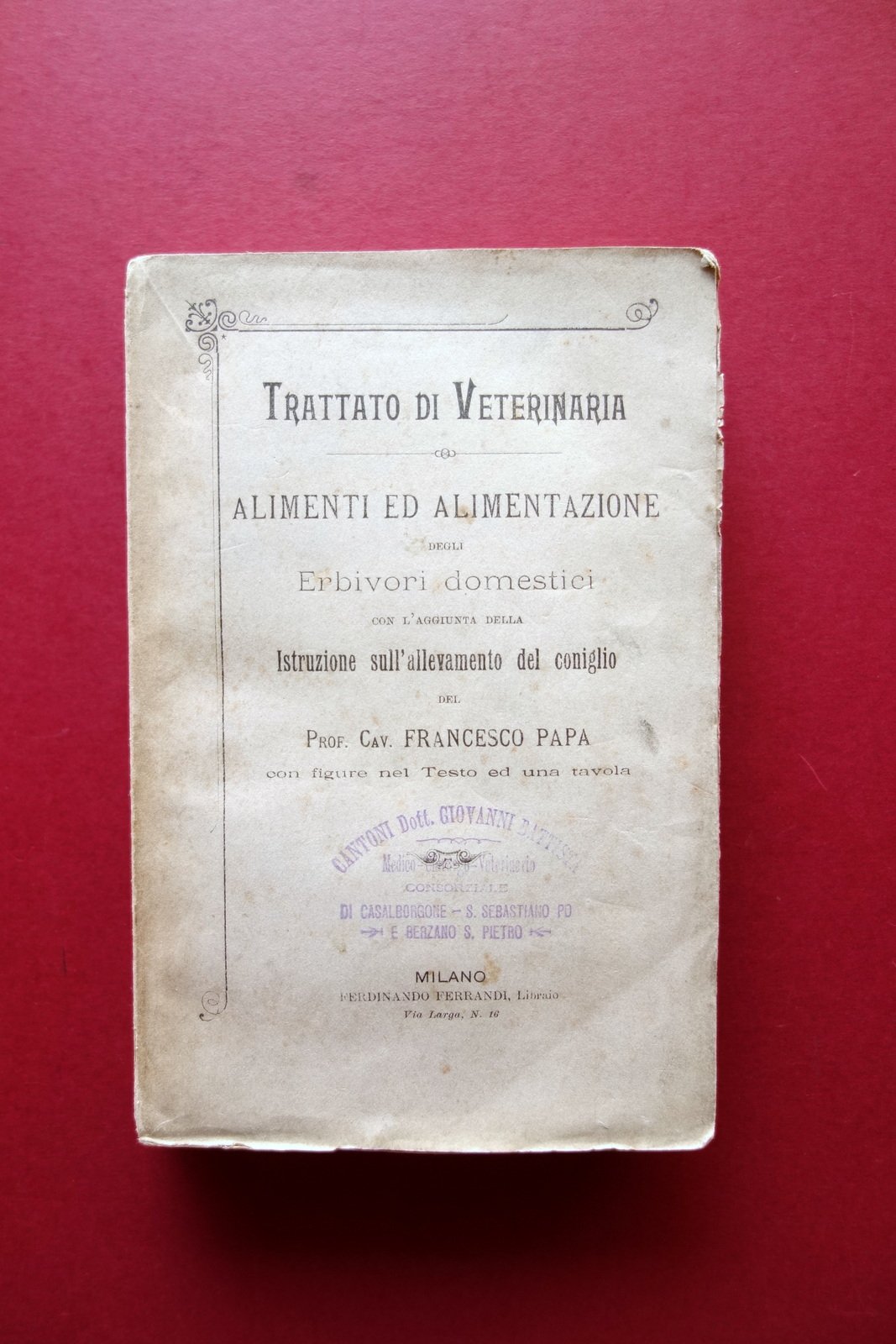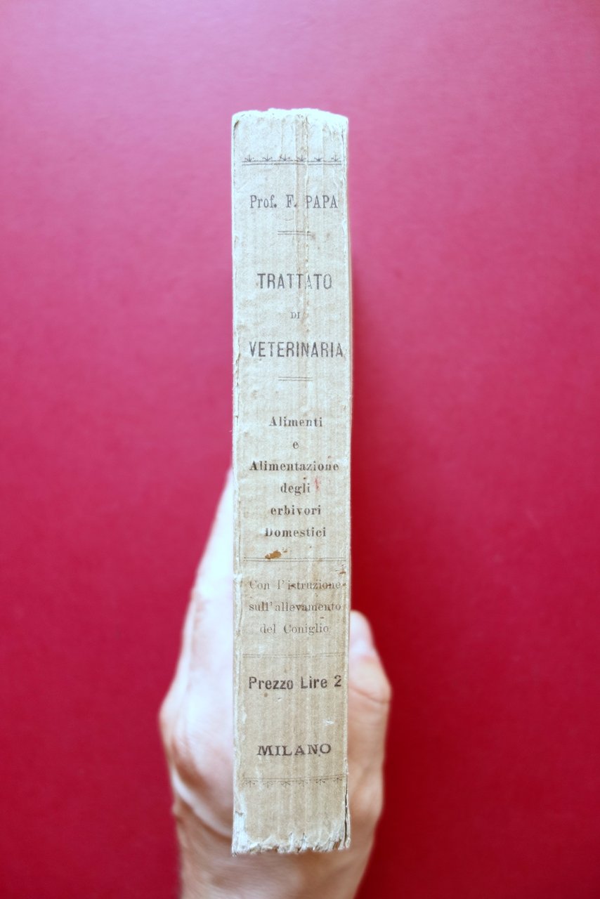 Francesco Papa, Trattato di Veterinaria - Alimenti ed alimentazione degli erbivori domestici con l'aggiunta della istruzione sull'allevamento del coniglio del Prof. Cav. Francesco Papa con figure nel testo ed una tavola Ferdinando Ferrandi Libraio, Milano, s. d. ma fine '800 circa; cm 19x12,5; pp. [4]-188 (parte prima); pp. 368 (parte seconda), con qualche fig. in b/n nel t. e una tavola ill. in b/n al termine del testo, ripiegata pi√π volte (vedi foto). Brossura ed. Brossura ant. e prima pagina con timbro - ex libris del precedente proprietario (raccolta privata). Condizioni di conservazione Esemplare in buone condizioni con tracce d'uso e alcune piccole leggere bruniture; cuffia inf. con qualche minuscola mancanza. Interni ben conservati. SETT214.L21000 N