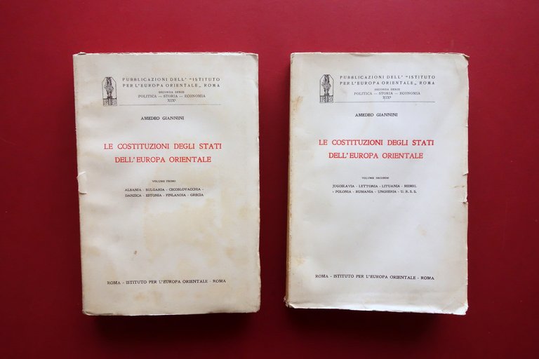 Amedeo Giannini, Le costituzioni degli stati dell'Europa Orientale volume primo: Albania - Bulgaria - Cecoslovacchia - Danzica - Estonia - Finlandia - Grecia volume secondo: Jugoslavia - Lettonia - Lituania - Memel - Polonia - Rumania - Ungheria - U.R.S.S. Istituto per l'Europa Orientale, Roma 1929; cm 24x16,5; pp. 344 (vol. 1); pp. da 345 a 680 (vol. 2); brossura ed. Alla prima bianca di ciascun volume timbro di vecchia biblioteca, volumi entrambi regolarmente annullati. Condizioni di conservazione Buone condizioni, ancora pressoché interamente intonsi (mai letti); brossure minimamente sgualcite ai margini e con pochi minimi taglietti; dorsi lievemente ingialliti e con alcune minime ombre di gore che non interessano gli interni, volumi entrambi compatti. Leggere bruniture alle brossure e ad alcune pagine. Opera completa in due volumi. Esemplari ancora pressoché del tutto intonsi (mai letti). SETT210.L24638 N