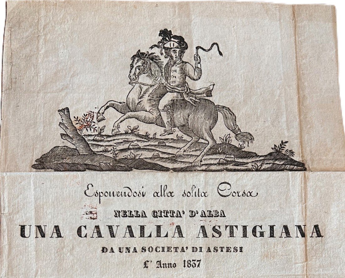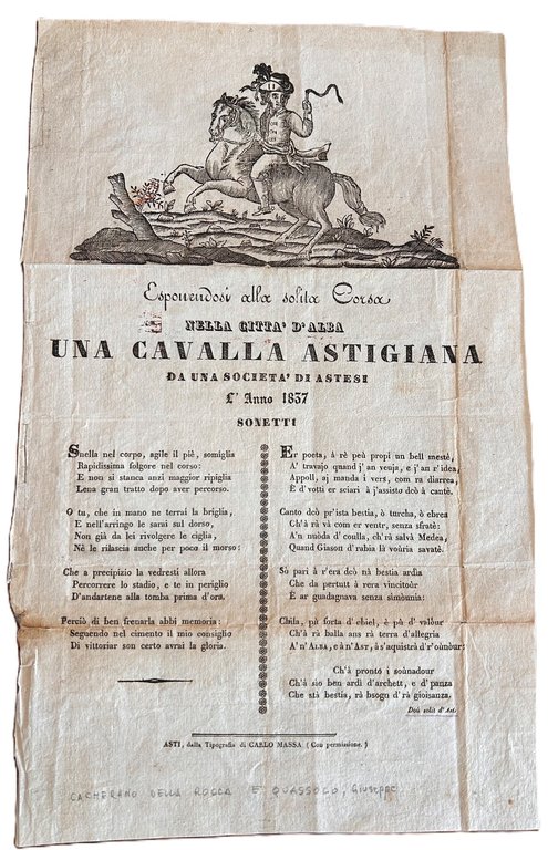 >Foglio volante originale ottocentesco (370x235 mm), nitidamente impresso e con grande testata xilografica nella parte superiore, raffigurante un cavaliere in sella con frustino. Sonetto in dialetto Piemontese ad opera Doù solit d'Ast” (identificabile con Cacherano della Rocca e Quassolo), distribuito ad Alba durante una corsa di cavalli.