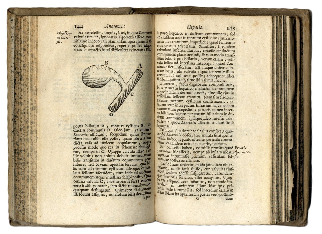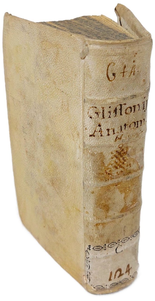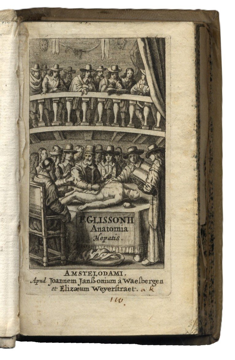 >in-12, pp. (48, incluso il titolo inciso), 423, (19). Legatura coeva in pergamena, titolo ms. sul dorso a nervi. Con grazioso antiporta inciso raffigurante un animatissimo teatro anatomico e aula di dissezione, 2 tavole incise in rame ripieg. f.t. raffiguranti il fegato, alcune figure xilogr. nel testo. Rara edizione (la prima era apparsa a Londra nel 1654) di interessante e rara opera sull'anatomia del fegato, di cui viene data ampia e dettagliata descrizione. La prima parte del volume espone nozioni di anatomia generale. L'autore (1597-1677) fu celebre medico inglese che ha dato, tra l'altro, il nome allo sfintere del dotto biliare. Ottimo esemplare. Krivatsy 4820.