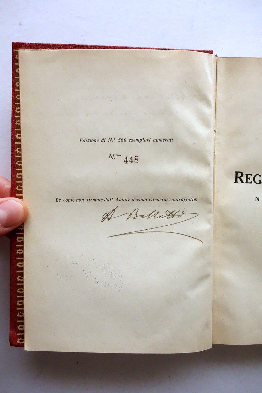 Andrea Balletti, La storia di Reggio nell'Emilia narrata ai giovani Poligrafica Reggiana, Reggio Emilia 1933; cm 19,5x13,5; pp. 312 con numerose ill. in b/n; tutto cartonato ed. telato con titolo impresso in oro al dorso e al piatto ant. Al dorso vecchia etichetta applicata. Al frontespizio e all'ultima pagina timbro di vecchia biblioteca, esemplare regolarmente annullato. Copia che reca un doppio autografo dell'autore: la firma anticontraffazione e una dedica all'antiporta. Tiratura di 560 esemplari numerati, n/s 448. Condizioni di conservazione Complessivamente molto ben conservato con leggere tracce d'uso. Interni anch'essi molto ben conservati. Copia che reca un doppio autografo dell'autore: la firma anticontraffazione e una dedica all'antiporta. Rara edizione originale. Tiratura di 560 esemplari numerati, n/s 448. SETT160.L25284 N P