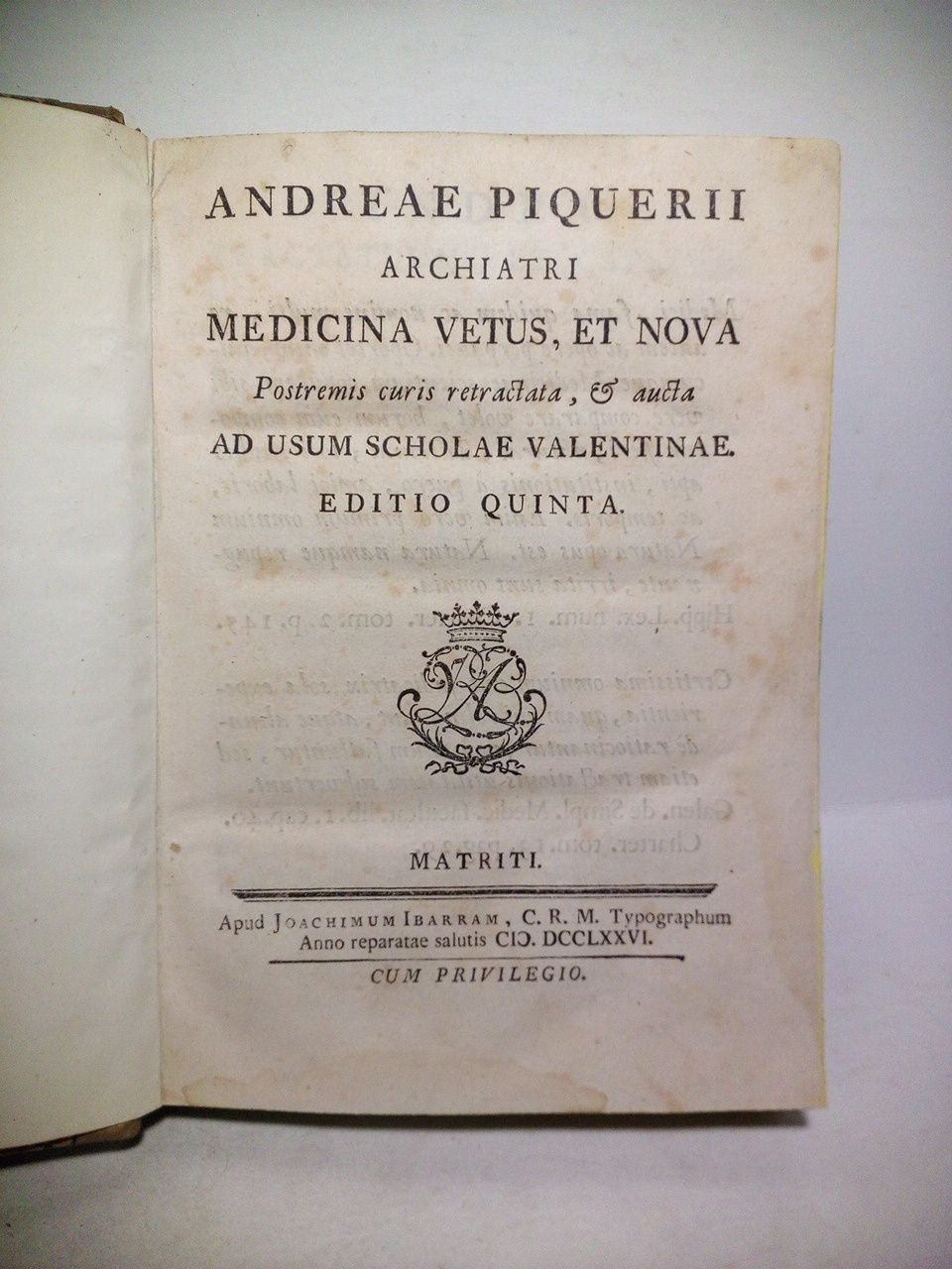 Andreae Piquerii Archiatri Medicina Vetus, et Nova. Postremis curis retractata, et aucta ad usum scholae valentinae. | Libri antichi e moderni | Piquerii, Andreae [Andrés Piquer Arrufat. 1711 - 1772]