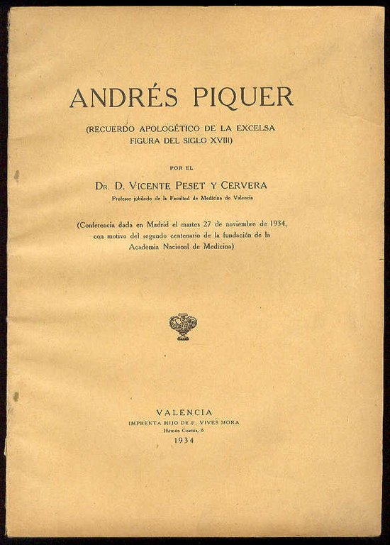 ANDRES PIQUER: Recuerdo apologético de la excelsa figura del siglo XVIII. (Conferencia dada en Madrid el Martes 27 de noviembre de 1934, con motivo del segundo centenario de la fundación de la Academia Nacional de Medicina) | Libri antichi e moderni | Peset Y Cervera, Vicente