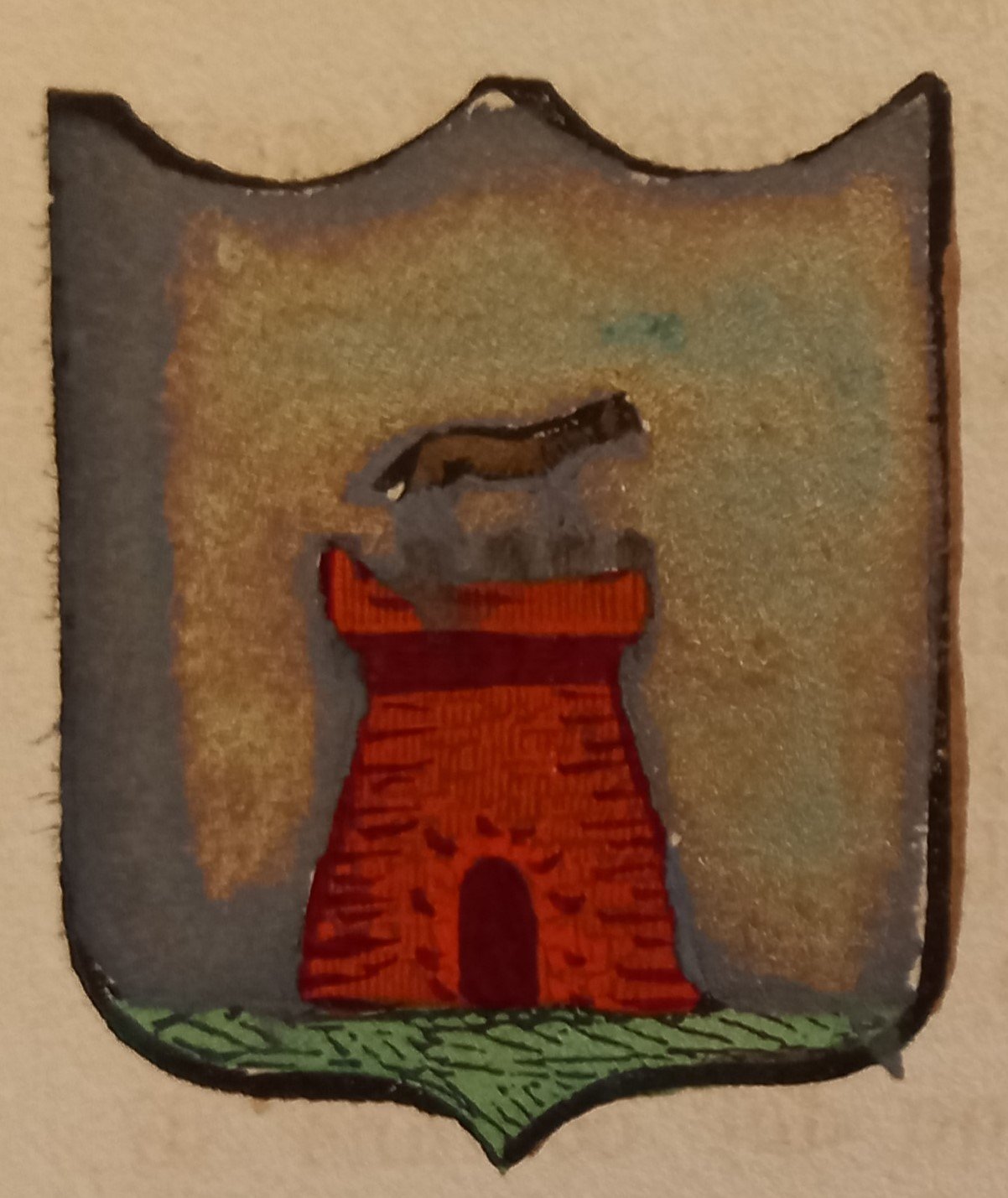 Piccolo stemma comunale colorato a mano d’epoca (cm. 3,8 x 3,2 ca.). Stralcio dal Dizionario Corografico illustrato dell’Italia, edito a Milano nel 1868. Ogni stemma di questa raccolta è inserito in una o più pagine di testo con la descrizione della località, notizie storico - geografiche e statistiche (numero degli abitanti e degli elettori, guarnigioni della Guardia Nazionale, ecc.). Spesso il testo è redatto da studiosi locali o dai sindaci, con maggiori, interessanti notizie.