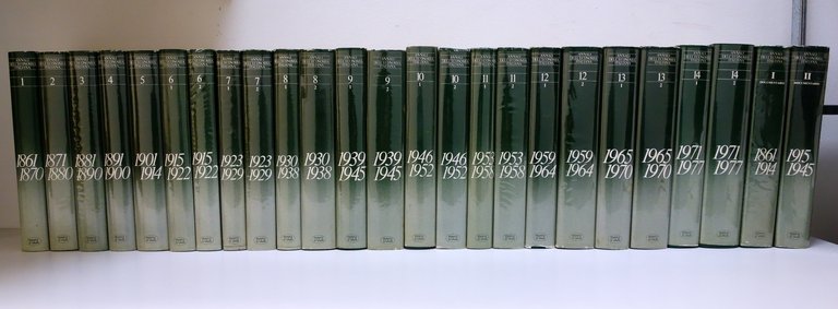 La più attenta e documentata pubblicazione sulla storia economica dell'Italia unita. Opera completa in 25 volumi, suddivisi in 23 di testo e in 2 volumi "documentario", ampiamente illustrati. Molto rara da reperirsi completa.