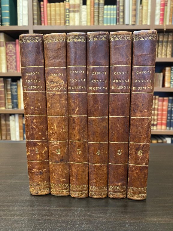 6 volumi in-8° (cm. 20), legatura leggermente successiva in mezza pelle nocciola, dorsi lisci con titoli, filetti e fregi in oro (minime tracce d'uso), piatti marmorizzati; pagine in carta azzurrina in stato molto buono; alcune gore marginali e leggere ossidazioni ai voll. II e IV, lievi e sporadiche fioriture, antica firma di appartenenza al frontespizio del vol. I. Seconda edizione definitiva di quest'importante opera storica pubblicata postuma a cura di Giambenedetto Gritta, che venne in possesso dei manoscritti originali di Filippo Casoni (morto nel 1723) e grazie all'editore Casamara li potè rielaborare e pubblicare. Esistono alcune varianti di tiratura: qui quella senza vignette ai frontespizi. Cfr. Manno VI, 22460. Esemplare molto buono. (SA4)