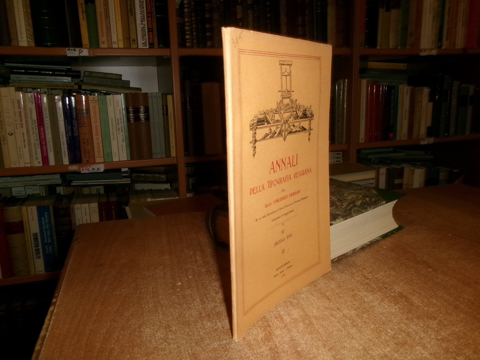 Dott. Vincenzo Ferrari. Reggio-Emilia, Bruno Rossi Editore, 1919. ANNALI della Tipografia Reggiana. In-8°, br. orig. xxiv, 32 pp. con una tavola più volte ripiegata f.t. Raro opuscolo in ottimo stato. Neg. mob. 2 entro busta trasp.