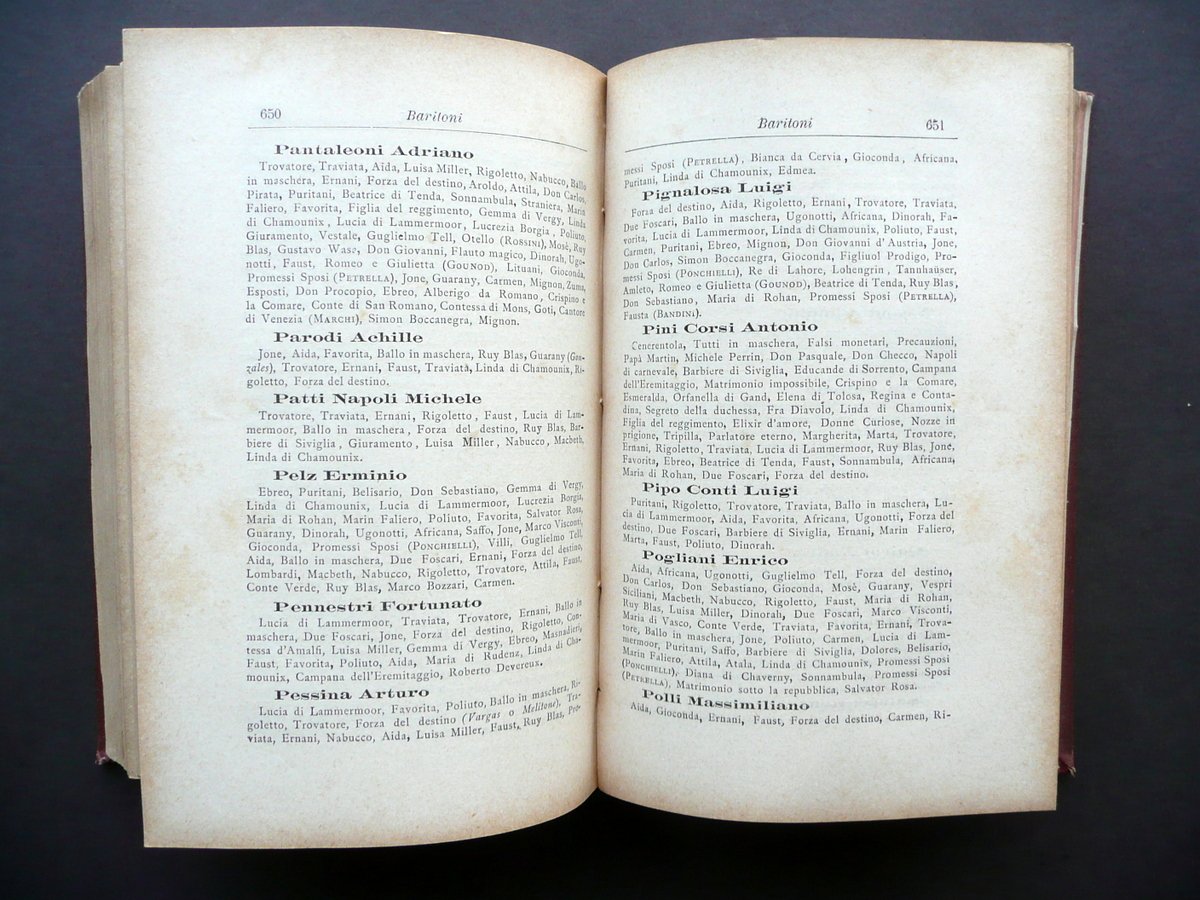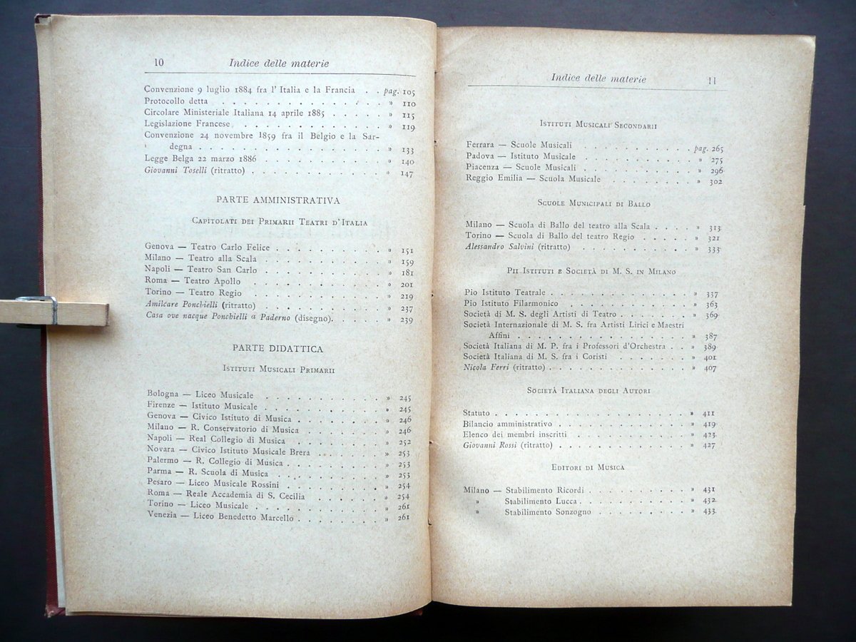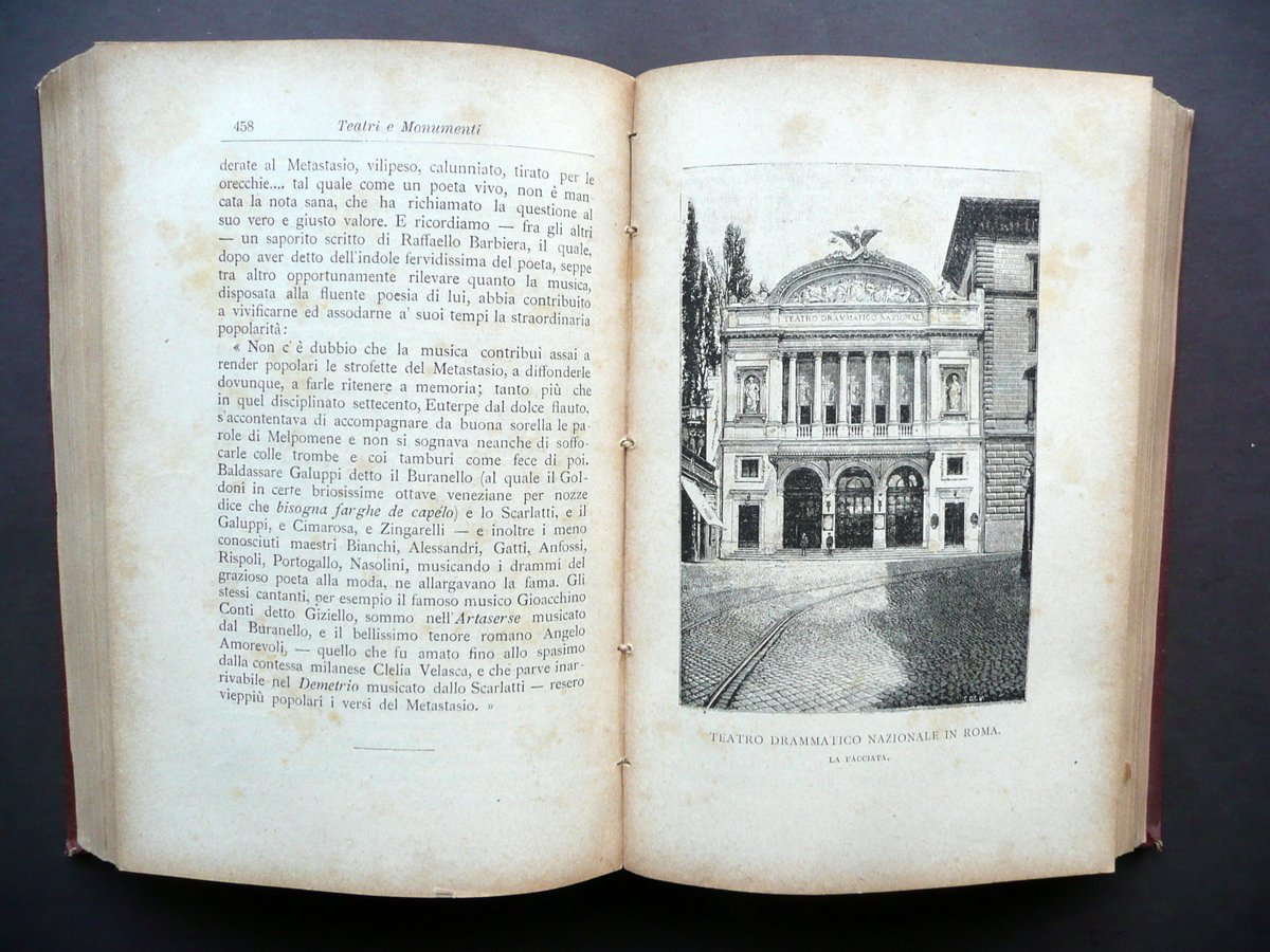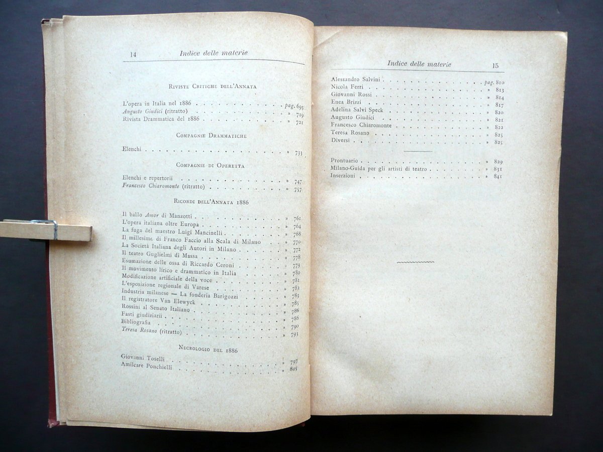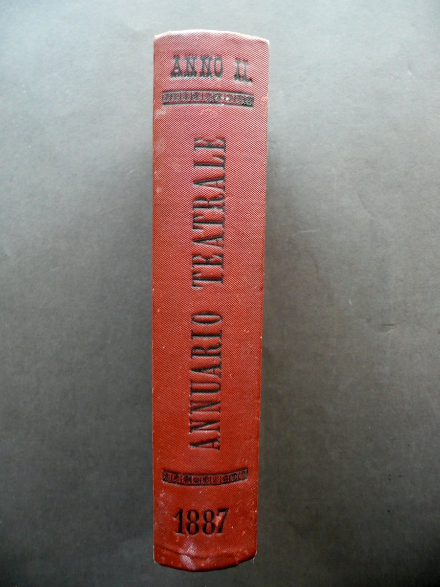 Prof. Enrico Carozzi, † Annuario Teatrale Italiano Per l'annata 1887 Tipografia Nazionale, Milano 1887, cm 18,5x12, pp. 840 - [8], con alcune ill. in b/n fuori t.; elegante legatura in tutta tela con titolo e fregi impressi in nero e a secco al dorso e ai piatti. † Condizioni di conservazione Esemplare ben conservato con tracce d'uso; coperta con pressochÈ trascurabili abrasioni agli angoli dei piatti, alle cuffie e alle cerniere. Interni buoni con alcune leggere bruniture e lievi ingialliture del tempo ai margini delle pagine. † Eccezionale fonte di notizie sugli interpreti, opere, compagnie drammatiche, stabili teatrali, maestri concertatori, istituti di teatro italiano, ecc. Esemplare molto raro. † SETT126.L12402 N