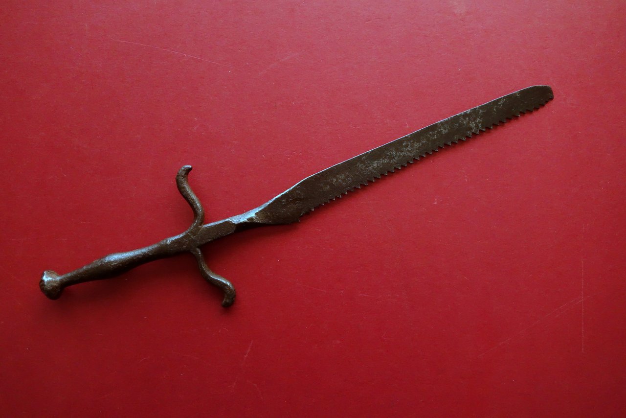Antico seghetto originale in ferro battuto, Antico seghetto originale in ferro battuto XVII° secolo circa strumento chirurgico(?) S. d. (XVII° secolo circa); antico seghetto interamente realizzato in ferro battuto, probabilmente utilizzato come strumento chirurgico. Originale. Dimensioni: cm circa 29x7,5. Condizioni di conservazione Buone condizioni con tracce d'uso e leggeri segni del tempo, minimi difetti e imperfezioni. Per ulteriori dettagli vedi foto. Originale d'epoca. SC04.D0445 N