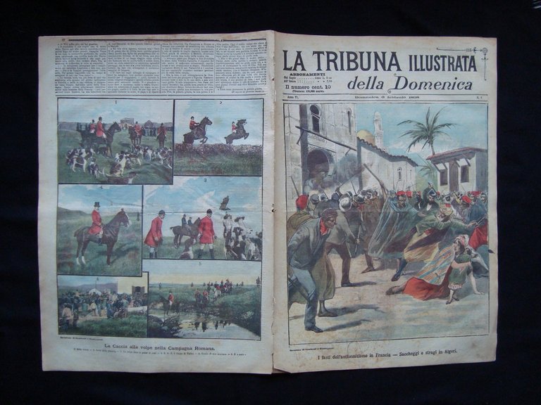 Rivista, I fasti dell'antisemitismo in Francia-Saccheggi e stragi in Algeri" "La caccia alla volpe nella Campagna Romana " Grande illustrazione a colori alla prima e alla ultima pagina di copertina de "La Tribuna Illustrata" 6 febbraio 1898 Roma 1898, cm 43x30, pp. 8 (numerazione progressiva annuale) con numerose ill. in b/n nel testo. e con due grandi ill. a colori alla prima e all'ultima pagina. Numero completo. Condizioni di conservazione Esemplare in buone condizioni con tracce d'uso, alcune piccole lievi bruniture e piccole macchiette; margini e angoli con qualche minima imperfezione, pagine interne con alcune minuscole mancanze e separate per distacco da volume rilegato, dorso con piccole mancanze, segni a matita alla prima di copertina, piega centrale conservativa. Numero completo. Ulteriori dettagli all'articolo interno. In prima pagina scena di violenza antisemita in Algeri . In quarta e ultima di copertina scene di vai episodi della caccia alla volpe nella campagna romana. SC03.D4647F blu "