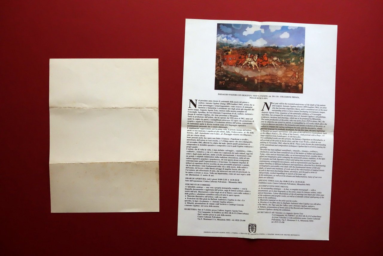 Locandina e lettera di mostra antologica, Mostra Antologica di Antonio Ligabue (1899-1965) promossa dal Comune di Mirandola organizzata e curata da Augusto Agosta Tota con il supporto di Gazzetta di Modena - Gazzetta di Reggio - Gazzetta di Mantova - Gazzetta di Carpi Centro Culturale Polivalente - Mirandola 5 ottobre 1984 - 6 gennaio 1985 Ed. Augusto Agosta Tota - Graphital, Parma 1985; piccolo manifesto - locandina con grafica a colori; al retro breve testo di presentazione bilingue italiano / inglese. Graphic Design di Franko Benedetti. Cm 42x29,5. Acclusa lettera di invito all'inaugurazione della suddetta mostra, cm 29,5x21. Condizioni di conservazione Locandina in buone condizioni con pieghe di conservazione, alcuni minuscoli aloni e graffietti al lato anteriore. Lettera di accompagnamento in buono stato con pieghe per spedizione, minime / leggerissime bruniture. SC03.D18767 N