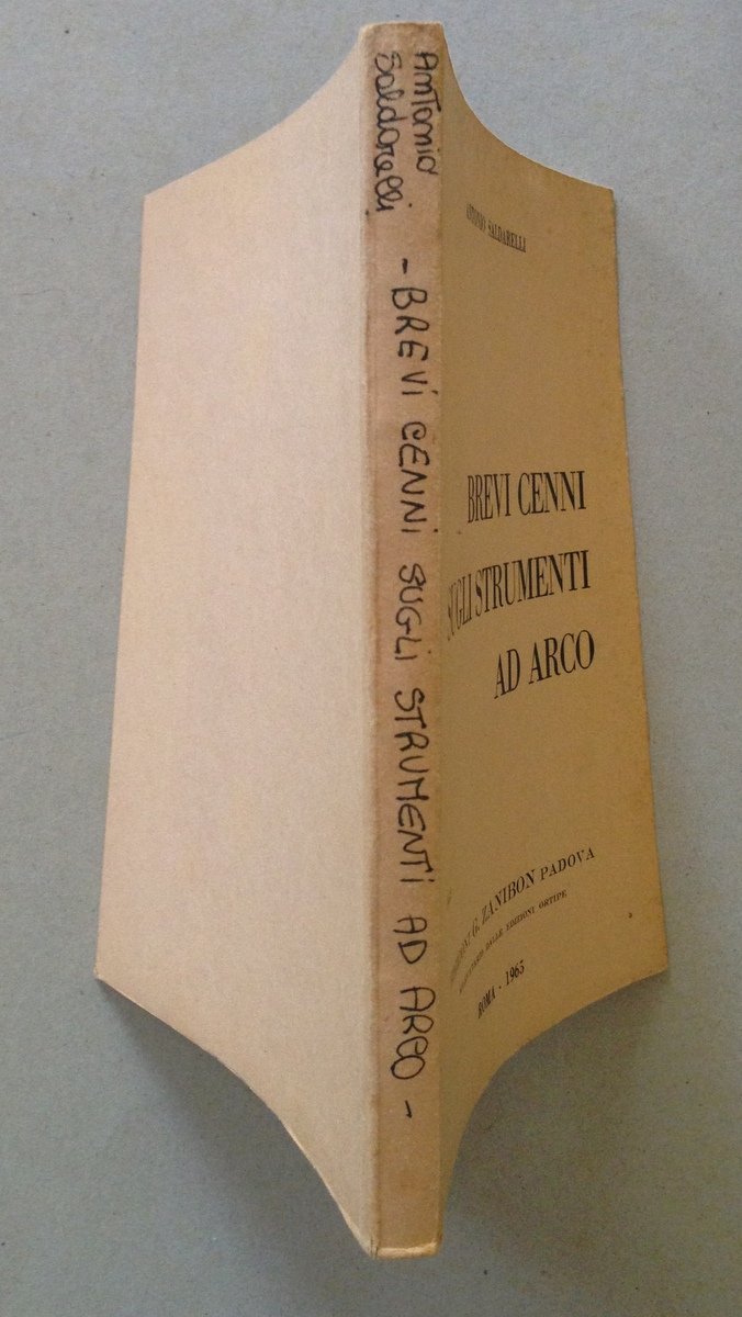 Antonio Saldarelli, Brevi cenni sugli strumenti ad arco Edizioni Zanibon Padova, Roma 1965, cm. 21x15.5, pp. 240; br. ed.; titoli a mano al dorso; foglietto errata corrige. Condizioni di conservazione Esemplare in buono stato con leggere tracce d'uso; brossura editoriale con minime abrasioni e pieghette e con qualche fioritura; interni buoni, frontespizio leggermente ingiallito ai margini. SETT127.L12574 MT