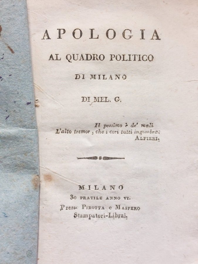 Apologia al quadro politico di Milano di Mel. G. | Libri antichi e moderni | Gioia Melchiorre.