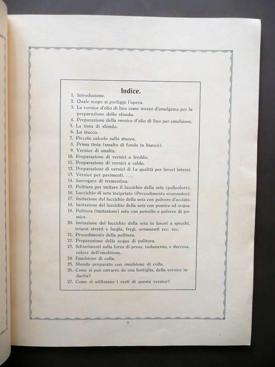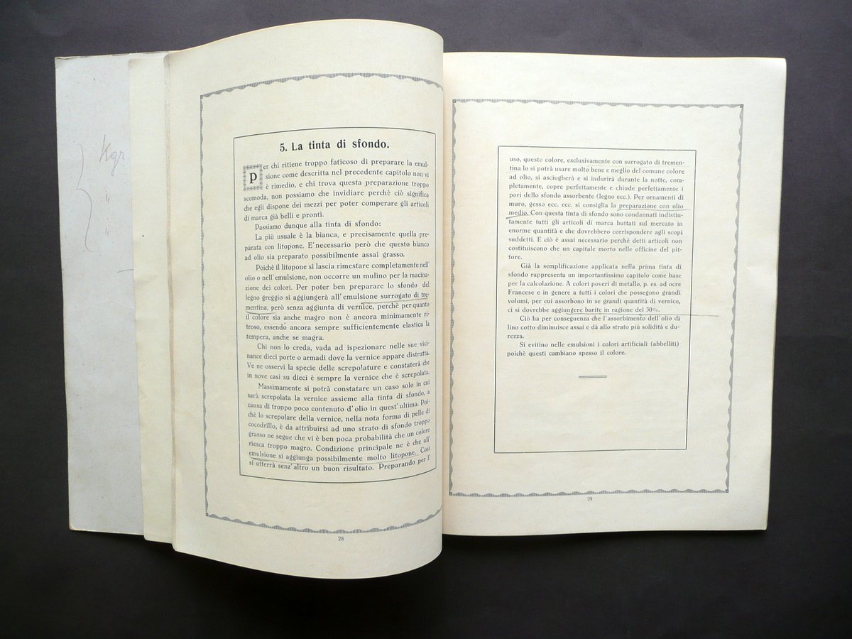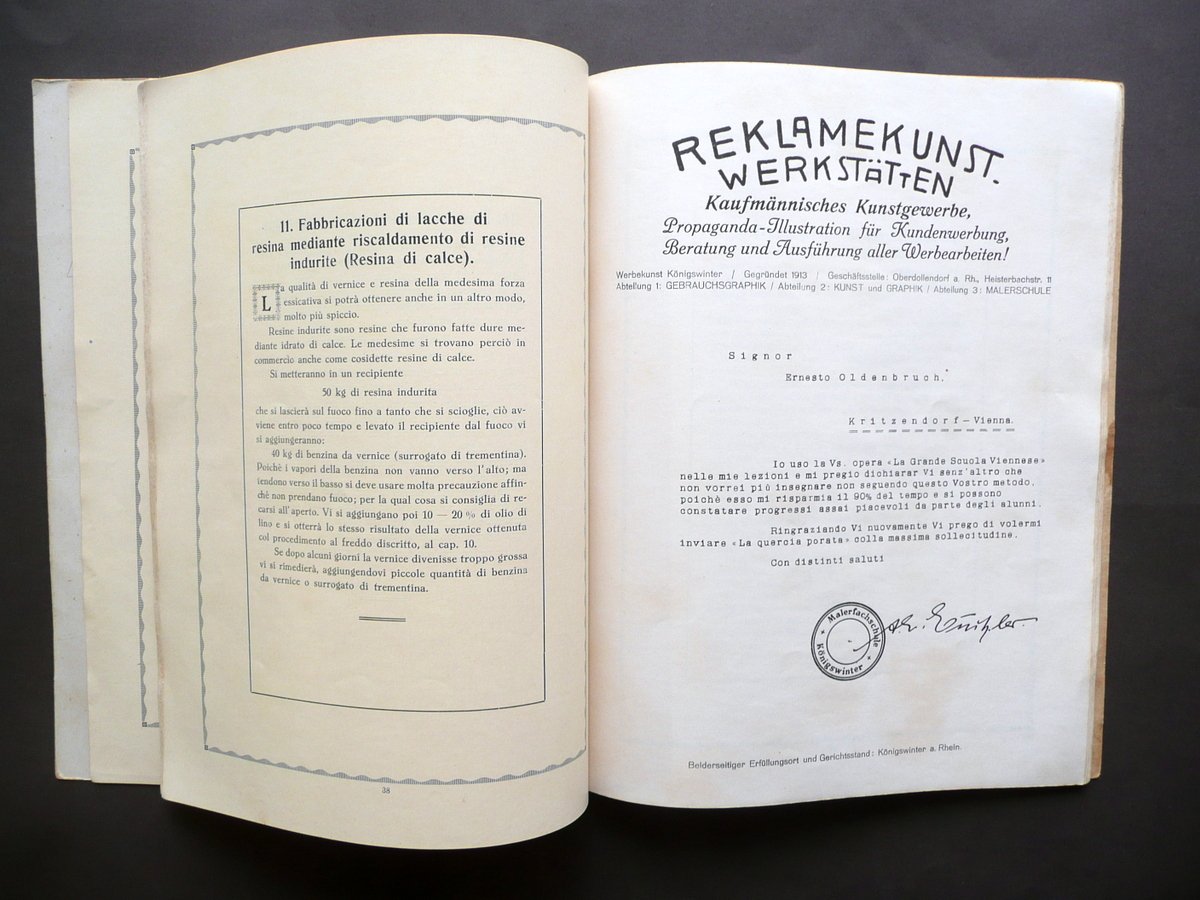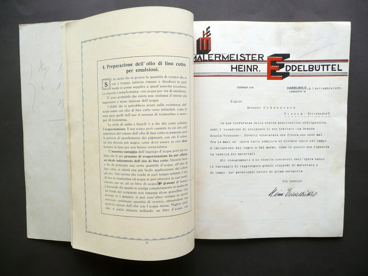 Fascicolo, Appendice alla grande scuola viennese Editore Ernesto Oldenbruch, Vienna, s. d. (anni '30 del Novecento circa); cm 29x22,5; pp. 72 pi√π alcuni fac simili di lettere di encomio fuori t.; brossura ed. con grafica a colori (dorso restaurato, vedi foto). Condizioni di conservazione Esemplare ben conservato con tracce d'uso e alcune leggere bruniture; brossura post. con pochi minimi segnetti a matita e una lieve traccia di piega all'angolo inf.; dorso restaurato mediante l'applicazione di una striscia in tela, con uno strappetto di qualche cm alla cuffia inf.; seconda di copertina e qualche pagina con sottolineature e/o annotazioni a matita (vedi foto); margine sup. di un fac simile fuori t. con vecchia annotazione abrasa (vedi foto). Interessante fascicolo che illustra le tecniche di lavorazione e verniciatura per la realizzazione di mobili in legno (vedi foto indice). SETT136.L13371 N