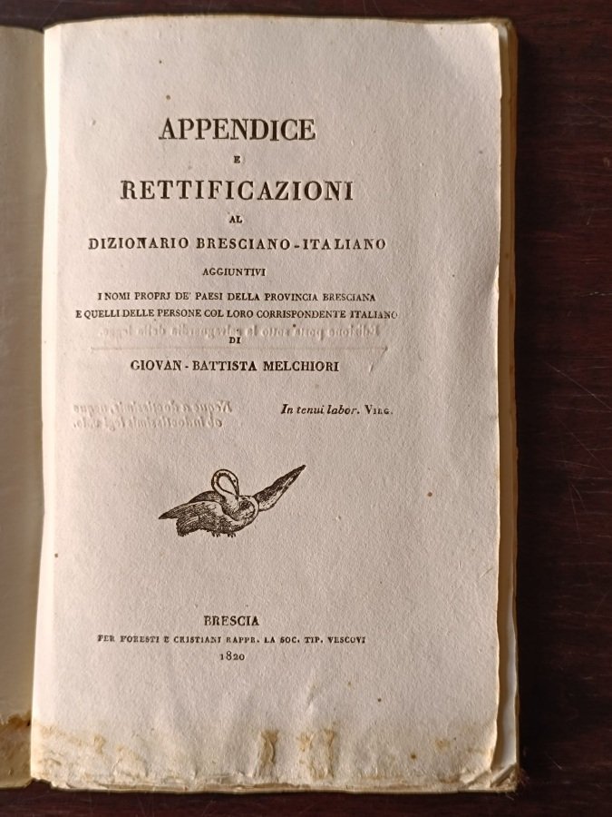 Appendice e rettificazioni al Dizionario bresciano-italiano aggiuntivi i nomi proprj de' paesi della provincia bresciana e quelli delle persone col loro corrispondente italiano. | Libri antichi e moderni | Melchiori Giovanni Battista.