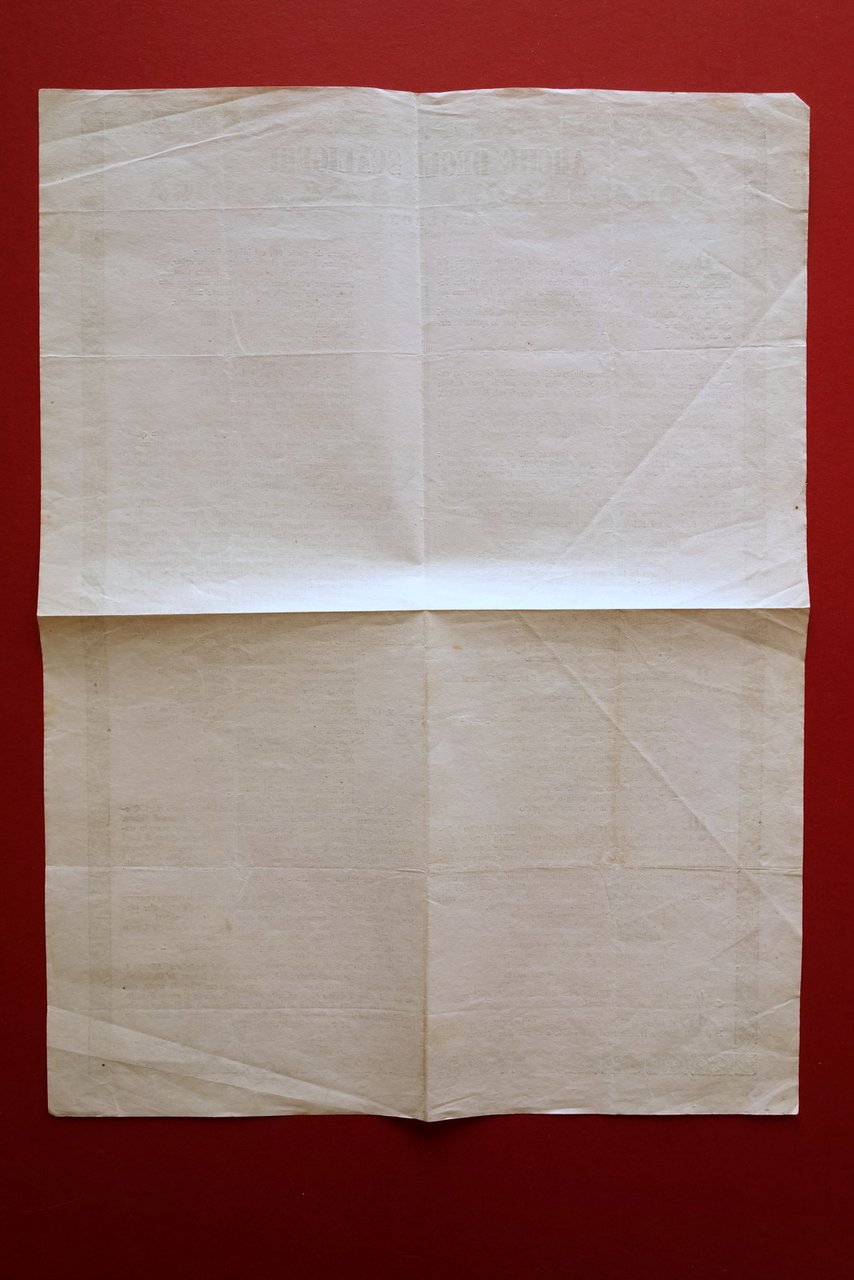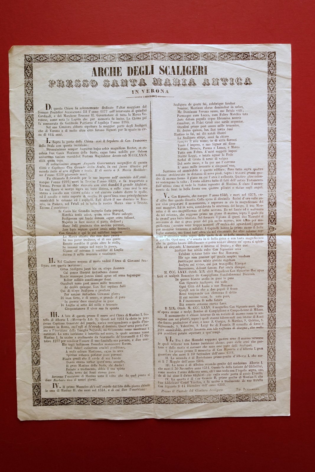 Foglio volante, Arche degli Scaligeri presso Santa Maria Antica in Verona Tip. Bennassutti, s. d. (metà Ottocento circa); cm 40,5x30; testo su due colonne, riquadrato entro cornice in b/n. Retro bianco. Condizioni di conservazione Esemplare ben conservato con leggere tracce d'uso, normali pieghe di conservazione e qualche lieve traccia di piega, poche trascurabili bruniture. Interessante foglio volante che veniva consegnato al custode del cimitero scaligero, con descrizione delle arche" e indicazione della loro collocazione all'interno del cimitero. SC03.D16207 N "
