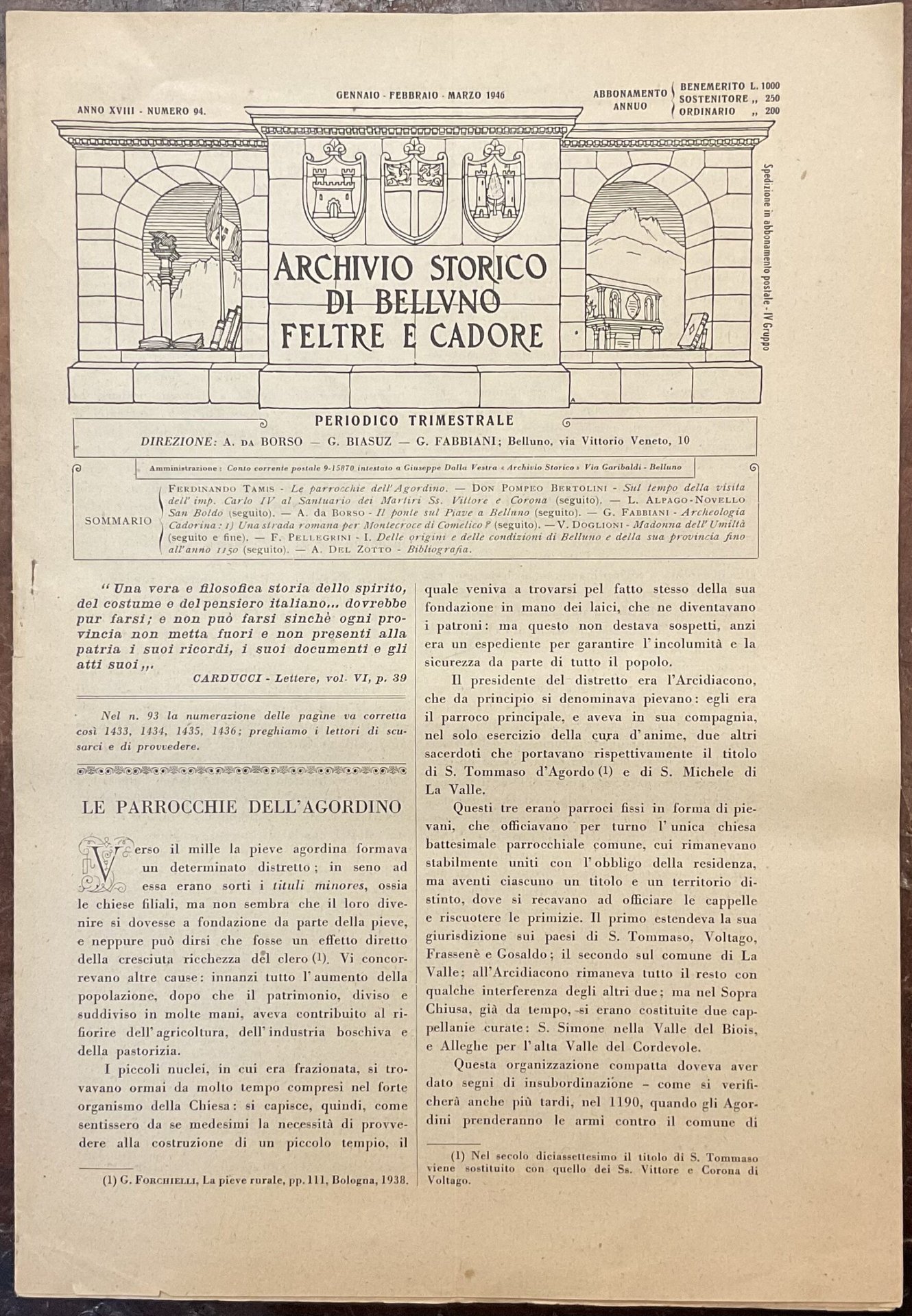 Archivio Storico di Belluno Feltre e Cadore. Anno XVIII. Numero 94. Gennaio-Febbraio-Marzo 1946 | Libri antichi e moderni | Testi Di Aavv