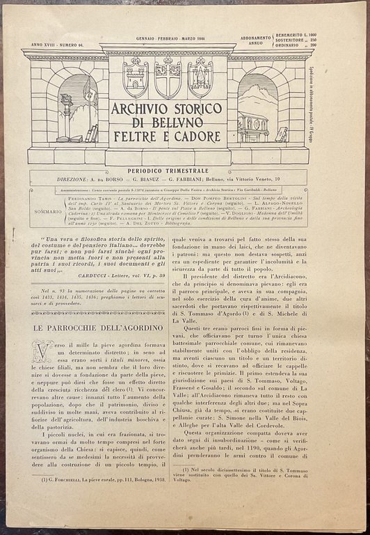 Archivio Storico di Belluno Feltre e Cadore. Anno XVIII. Numero 94. Gennaio-Febbraio-Marzo 1946