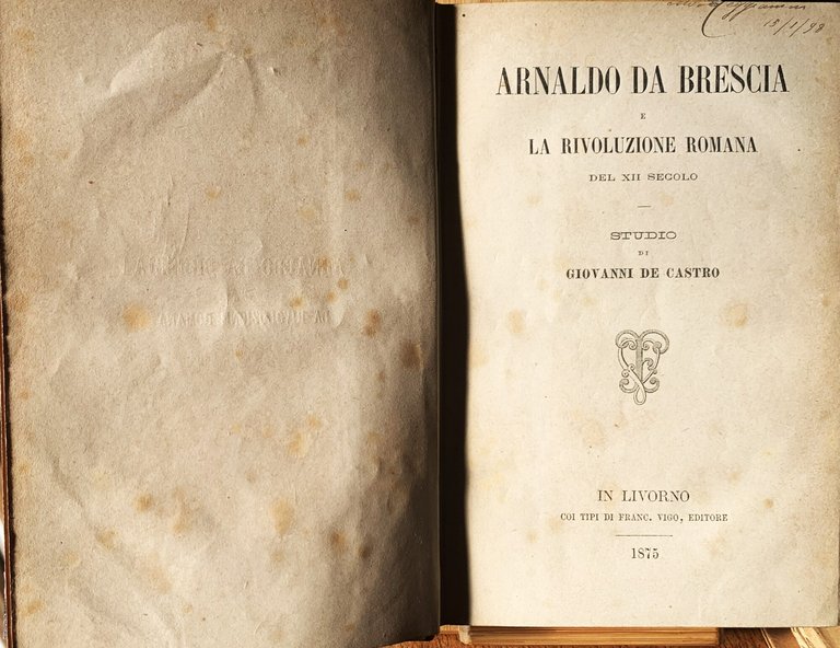 I ed.. XVI/ viij+568/ rilegatura in mezza pelle (dorso in pelle marrone con titoli e ornati dorati; piatti incarta marmorizzata rosa scuro/nero). Stato buono (usura della copertina - firme di possesso a matita all'occhiello e in frontespizio - bruniture e fioriture nei fogli di gardia e nelle pagine). Indice: introduzione - Autori che parlano di Arnaldo - Capitoli Primo-XXII - Documenti - Schiarimenti ed aggiunte.