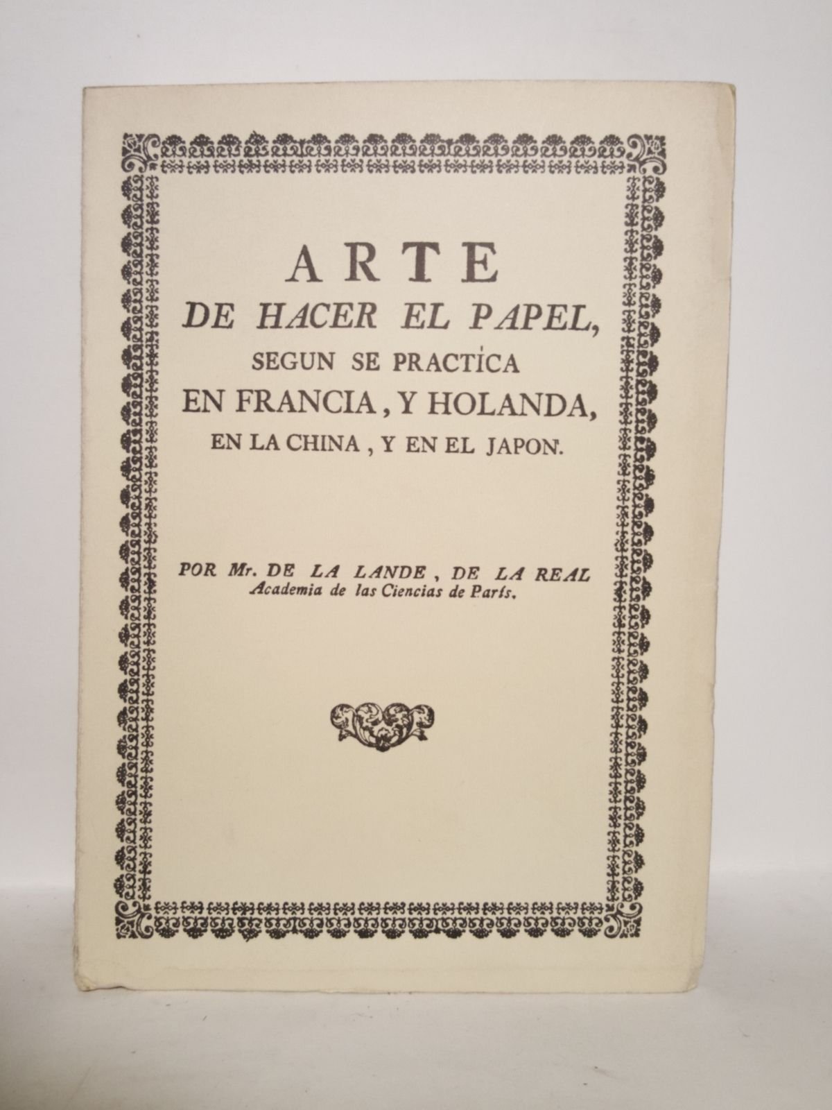 Arte de hacer el papel, según se practica en Francia, y Holanda, en la China, y en el Japón. Descripción de su origen: De las diferentes materias de que puede fabricarse: De los molinos Holandeses, y de los de Cylindros; y del Arte de hacer los Cartones, caxas, y varios adornos de pasta / Escrito en francés por., y traducido de orden de la Real Junta General de Comercio, Moneda, y Minas, con aprobacion de S.M., por Don MIGUEL GERONYMO SUAREZ Y NUÑEZ. | Libri antichi e moderni | Lande, Mr. De La