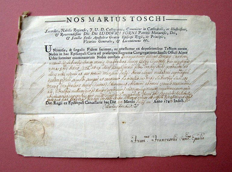 Attestato, Nos Marius Toschi .liberum. vinculo matrimoniali. - Attestato per liberazione da vincolo matrimoniale Reggio Emilia datato 22 luglio 1743 1743; attestato su carta, parti bianche manoscritte, sigillo in rilievo (vedi foto), cm 23x30,5 c.a. Condizioni di conservazione. Esemplare in buone condizioni con tracce del tempo; normali pieghe di conservazione, margini con strappetti e piccole mancanze, il destro leggermente rifilato. Per ulteriori dettagli vedi foto. SC03.D19126 blu