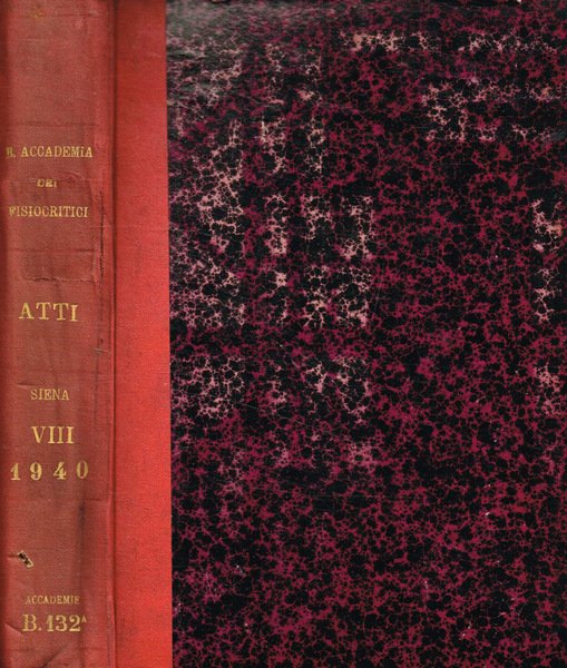 Volume diviso in due parti, Atti della R.Accademia e Studi della Facoltà Medico Senese, 239+289, pagine brunite ai bordi e con sporadica fioritura, illustrazioni in nero nei testi e f.t., rilegatura in mezza tela, piatti cartonati, scoloriti e con segni di usura ai bordi, dorso scurito, con titoli d'oro, velo di polvere, strappo e tracce di colla. Numero pagine 528