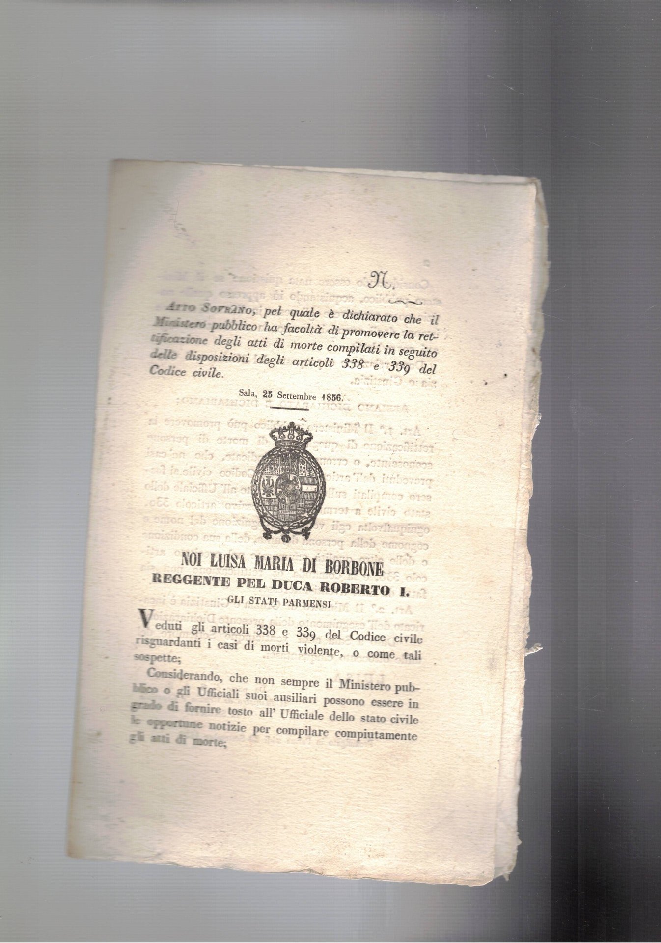 Atto sovrano pel quale il ministero pubblico può promuovere la rettificazione degli atti di morte compilati in seguito alle disposizioni degli art. 338 e 339 del codice civile. Sala 25 sett. 1856. | Libri antichi e moderni | Luisa Maria Di Borbone Reggente Pel Duca Roberto I°.