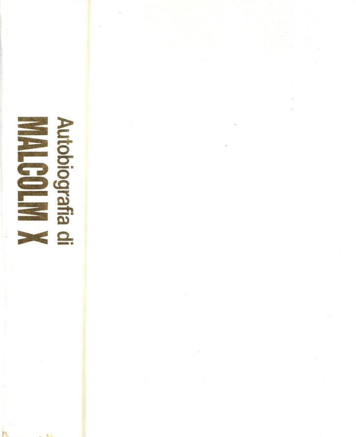 Autobiografia di Malcom X tradotta da Roberto Giammanco. Volume rilegato telato bianco, titoli incisi in oro al dorso, pigmento appesantito da esposizione alla luce e da polvere, bordi stanchi, macchia da umido alla cuffia inferiore. Fogli saldi alla cerniera, alcuni presentano macchie da contatto e sgualciture, testo fruibile, tonalità ossidate maggiormente in cornice, pulviscolo ai tagli bruniti. N. pag. 513.