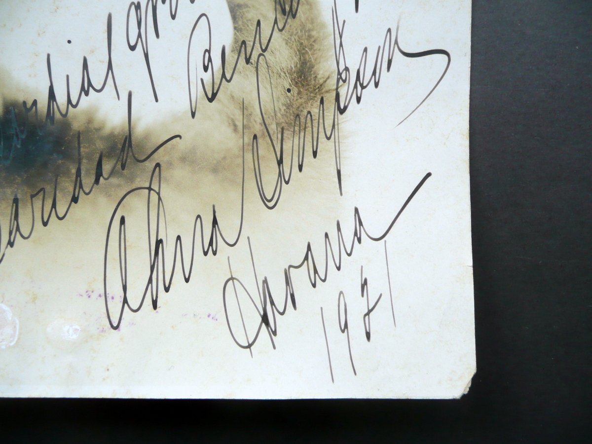 Fotografia originale autografa, Alma Simpson Fotografia originale autografa firmata Datata Havana, 1921 (?) Fotografia originale datata Havana, 1921(?), con tre righe di dedica e firma autografe a penna alla parte inf. (vedi foto); retro con vecchi timbretti descrittivi sullo scatto (vedi foto). Cm 21,5x16,5. Condizioni di conservazione Esemplare complessivamente ben conservato con tracce d'uso, alcune minuscole lievissime bruniture, margine inf. con un paio di minime abrasioni; angoli con minimi difetti e una trascurabile mancanza; retro dei quattro angoli con una piccola lieve abrasione e tracce di precedente conservazione dell'esemplare in album (vedi foto). SC03.D11960 N