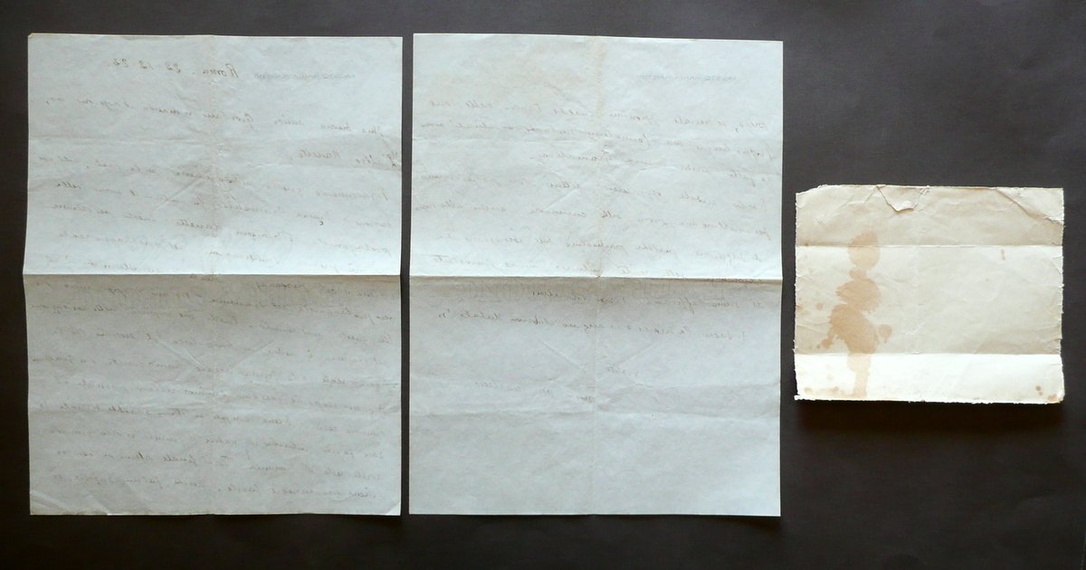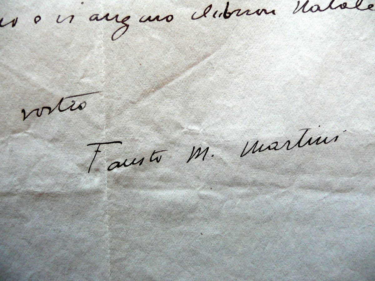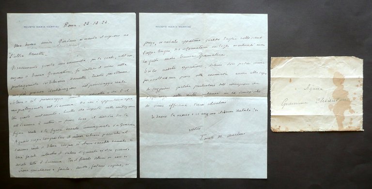 Lettera autografa, Fausto Maria Martini (Roma 1886 - Ivi 1931) Lettera autografa firmata datata Roma, 22 dicembre 1922 Lunga lettera autografa firmata redatta su due fogli con intestazione a stampa de Fausto Maria Martini, datata Roma, 22/12/1922; testo redatto su due facciate, con firma autografa al termine del testo (vedi foto); margine sup. di un foglio con breve annotazione a matita del precedente proprietario. Cm 27,5x21,5. Acclusa busta originale di spedizione anch'essa autografa, parzialmente conservata (vedi foto). Condizioni di conservazione Lettera ben conservata con tracce d'uso, normali pieghe di spedizione, poche lievissime bruniture. Diretta all'attrice Giannina Chiantoni, per l'esecuzione della commedia L' altra Nanetta". Il Martini nel descrive le caratteristiche e l'esecuzione che ne fece Emma Giannatica, ne indica il motivo del cambio del titolo, gli eventuali tagli. Busta di spedizione autografa parzialmente conservata (vedi foto). SC03.D12758 N "