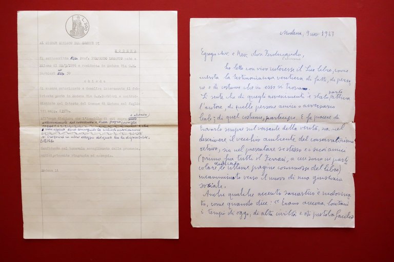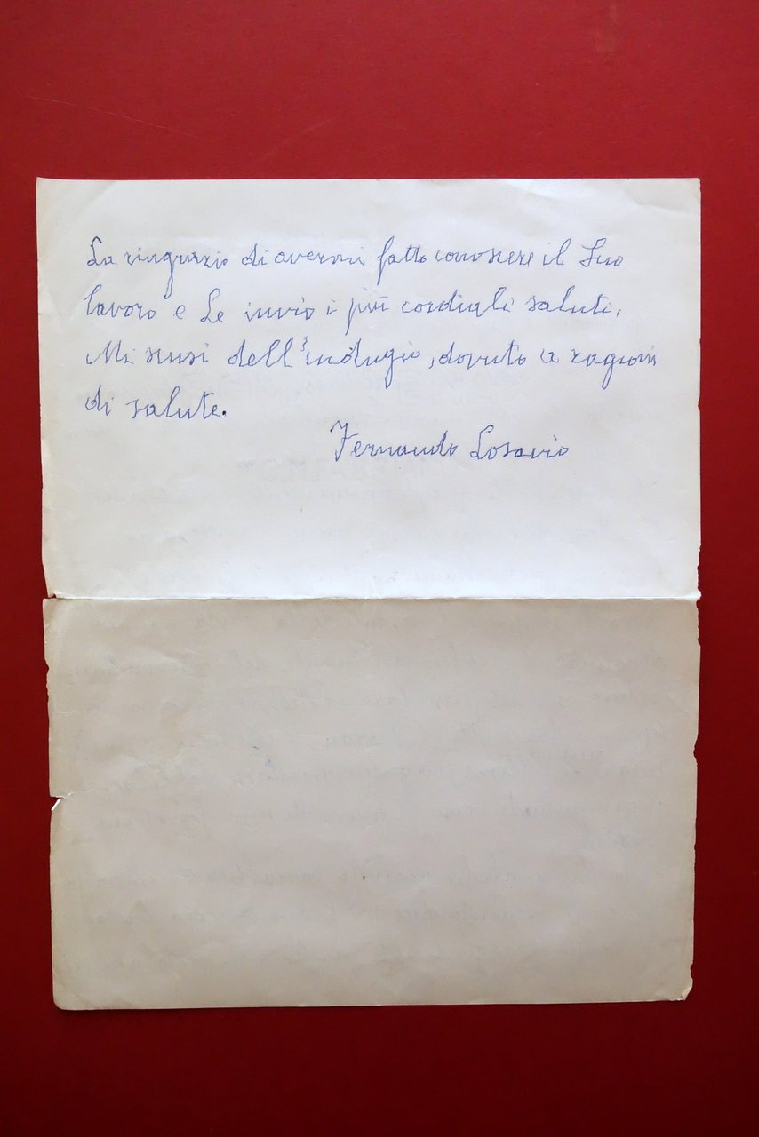 Lettera autografa firmata, Ferdinando Losavio (1896-1979) lettera autografa firmata datata Modena, 9 novembre 1967 Lettera autografa firmata su foglio in carta; firma autografa alla seconda facciata, al termine del testo (vedi foto). Cm 28x22. Acclusa bozza di richiesta per demolizione di abitazione, con correzioni autografe a penna blu (vedi foto). Condizioni di conservazione Lettera autografa in buone condizioni con tracce d'uso, normali pieghe per spedizione postale, margini con qualche minuscola mancanza e strappetto, un taglietto di un paio di cm al margine destro, in corrispondenza della piega conservativa. Personale, indirizzata a Don Ferdinando Padovani in merito a un commento su un suo scritto. Bel commento umano e politico. Acclusa bozza di richiesta per demolizione di abitazione, con correzioni autografe a penna blu (vedi foto). Provenienza raccolta Amorth. SC03.D18532 N