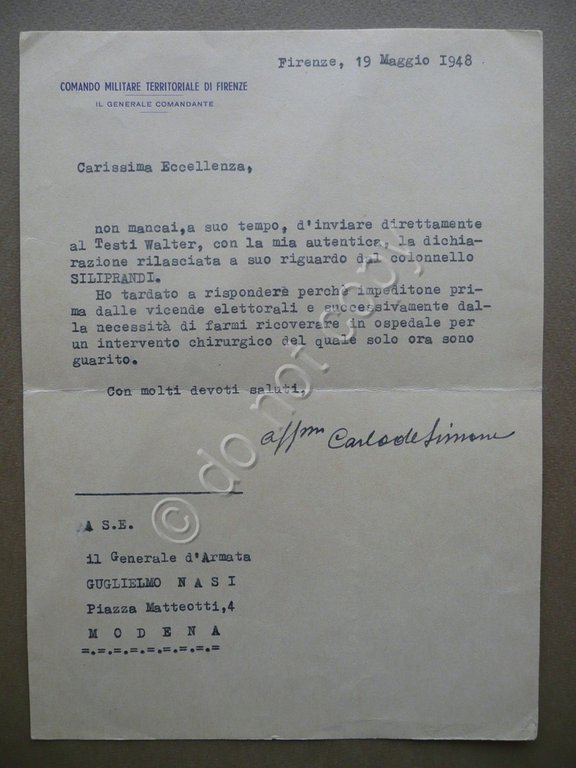 Autografo Generale Carlo de Simone Lettera Nasi Modena 1948 Difesa Harar AOI | Libri antichi e moderni |
