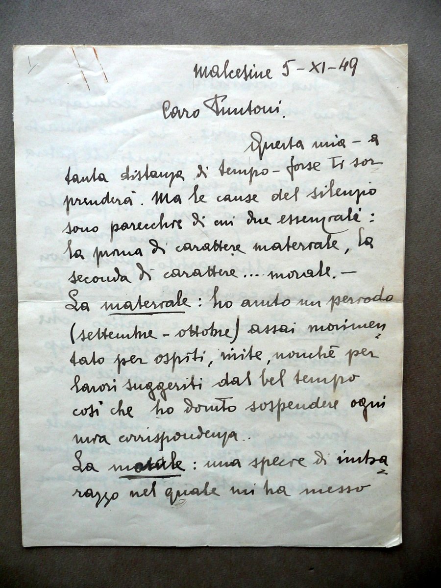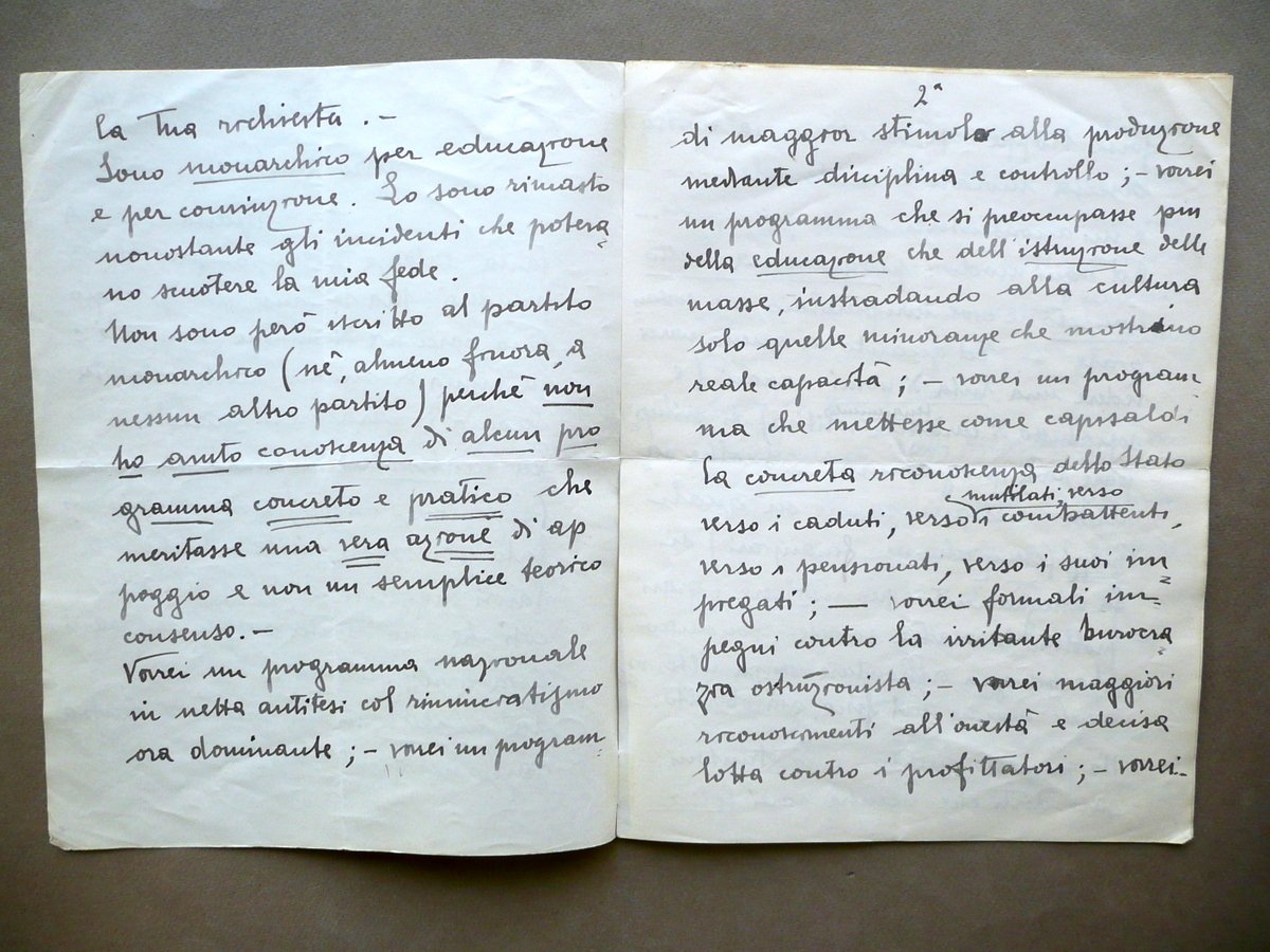 Lunga lettera autografa, Generale Alberto Pariani (Milano 1876 - Malcesine 1955) Lunga lettera di dodici facciate interamente autografa e firmata Datata Malcesine, 5 novembre 1949 Lunga lettera autografa firmata di dodici facciate, datata Malcesine, 5 novembre 1949; testo disposto su tutte e dodici le facciate, con firma autografa al termine del testo (vedi foto); fogli uniti tra loro ad un margine est. tramite piccoli pezzetti di nastro adesivo. Cm 28x21,5. Sono acclusi uno schedino dattiloscritto del precedente collezionista che contiene una breve biografia del Pariani e una descrizione dell'autografo, e un numero completo del quotidiano Corriere della Sera", datato 2 Agosto 1939, avente in apertura un articolo sulle grandi manovre militari del 1939 compiute dall'Asse e dai suoi alleati, alle quali il Pariani partecipò in qualità di generale del contingente italiano (vedi foto). Condizioni di conservazione Esemplare in buone condizioni con tracce d'uso, leggerissima traccia di piega centrale di spedizione, angoli delle pagine con minimi difetti e lievissimi accenni di pieghette; margine sup. della prima facciata con una lieve macchietta di ruggine dovuta a prolungato inserimento di vecchia graffetta. Bellissima e lunghissima lettera autografa firmata, diretta al Generale Puntoni, nella quale il Pariani espone nel dettaglio il suo orientamento politico, commenta con grande dovizia di particolari tre eventi a suo parere determinanti (nonché profondamente malgestiti) dal governo e dalla Monarchia italiana nel periodo della guerra e della sua immediata conclusione, e chiude con un parere sul Conte Villafranca di Soissons: "[.] Sono monarchico per educazione e per convinzione. Lo sono rimasto nonostante gli incidenti che potevano smuovere la mia fede. Non sono però iscritto al partito monarchico [.] perché non ho avuto conoscenza di alcun programma concreto e pratico che meritasse una vera azione di appoggio e non un semplice teorico consenso. [.] Dobbiamo tutti ricordare e riconoscere una impreparazione impressionante. Tre date: il 25 luglio '43 viene sostituito ad un governo dittatoriale [.] Un governo abulico, improvvisato negli uomini, senza programma [.] Ricordi? L'8 settembre '43 alle 9:30 fui ricevuto in udienza da S. M. [.]". SC03.D12118 N "