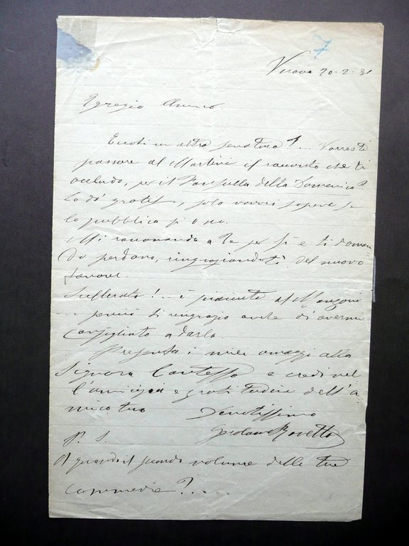 Lettera autografa, Gerolamo Rovetta (Brescia 1851 - Milano 1920) Lettera autografa firmata Datata Verona, 20 febbraio 1891(?) Lettera interamente autografa firmata su foglio in carta, datata Verona, 20 febbraio 1891; testo interamente disposto ad un'unica facciata, con firma autografa al termine del testo, antecedente al post scriptum (vedi foto); cm 21x13,5. Condizioni di conservazione Lettera complessivamente ben conservata con tracce d'uso e minimi segni del tempo, normali pieghe di spedizione, angoli con qualche lievissima traccia di piega; margine sup. e un margine est. con un piccolo strappetto in corrispondenza della piega di spedizione, restaurato mediante nastro adesivo applicato al retro; un angolo sup. con una piccola mancanza anch'essa restaurata con nastro adesivo. Margine inf. del retro con breve rimovibile annotazione a matita del precedente collezionista Di bel contenuto personale: [.] Vorresti passare al Martini il racconto che ti accludo, per il Fanfulla della Domenica? Lo do gratis, solo vorrei sapere se lo pubblica o no. [.] Scellerato!. è piaciuto al Manzoni. perciò ti ringrazio anche di avermi consigliato a darlo. [.]". La nota a matita del precedente collezionista presente al retro corrisponde a un'ipotesi del destinatario (probabilmente Leo di Castelnuovo, pseudonimo di Leopoldo Pullé). SC03.D12497 N "